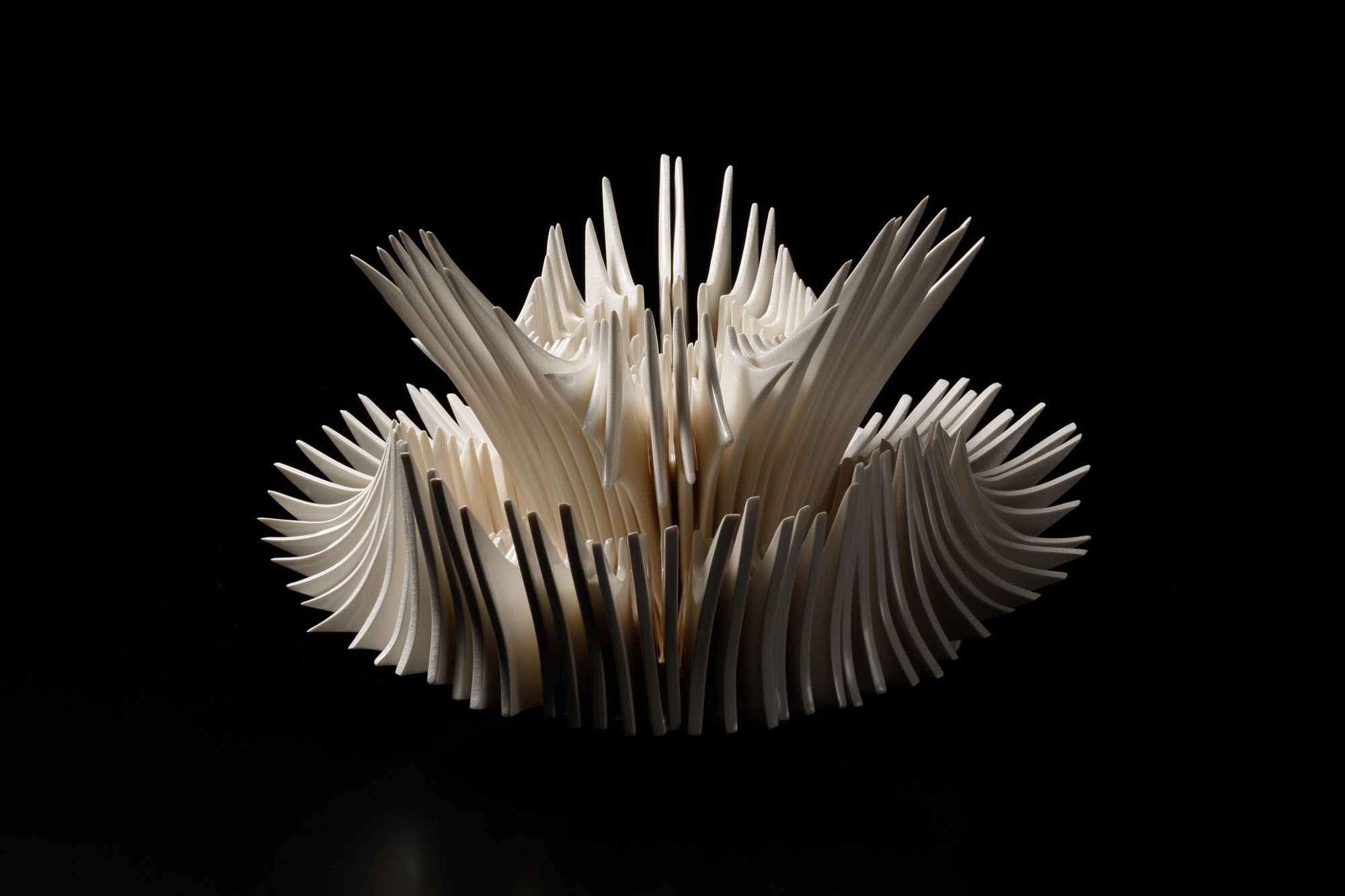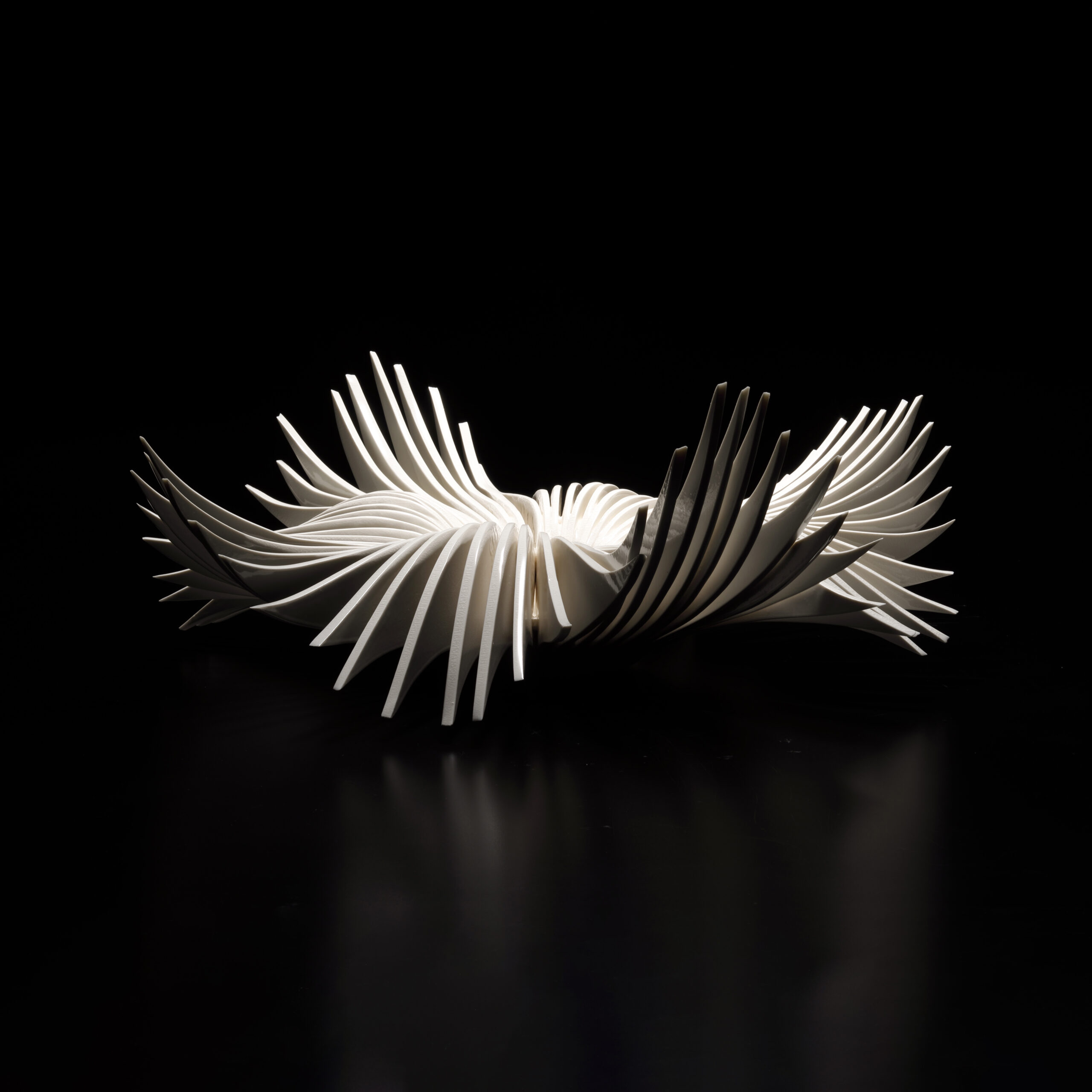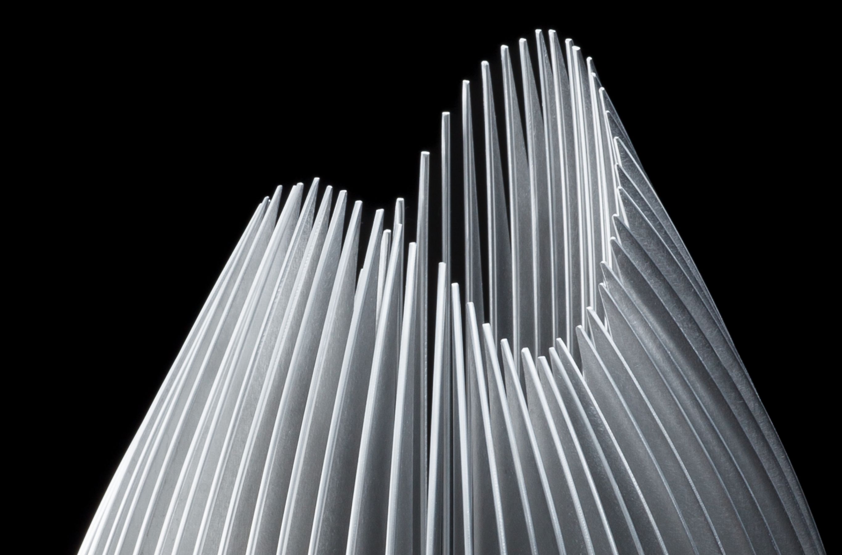 そのアートからBone Flower Luminousは生まれた。アルミニウム金属板に研磨加工を何度も行うことで独特な光沢を得たのちに、アルマイト処理(陽極酸化処理)で生成した多孔質皮膜に、金属塩を含む電解液中で電気分解を行い、皮膜の孔の中に金属や金属化合物を析出させて着色する、いわゆる電解着色を施し、対候性を高めた。隣り合う金属片を互いに緊結させ、最終的に全てが支え合うことで作品は構造的に自立している。