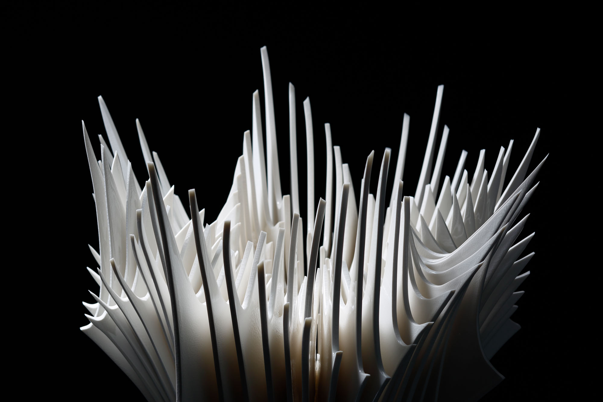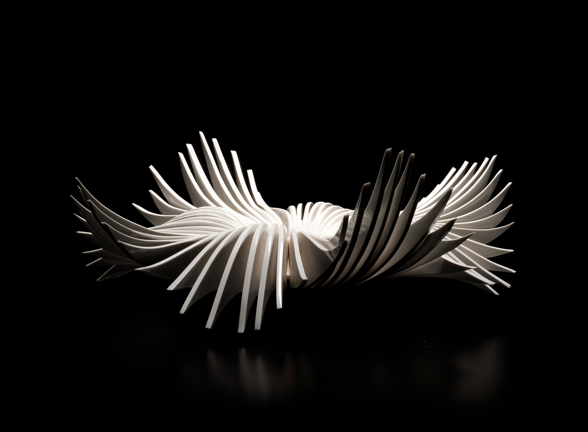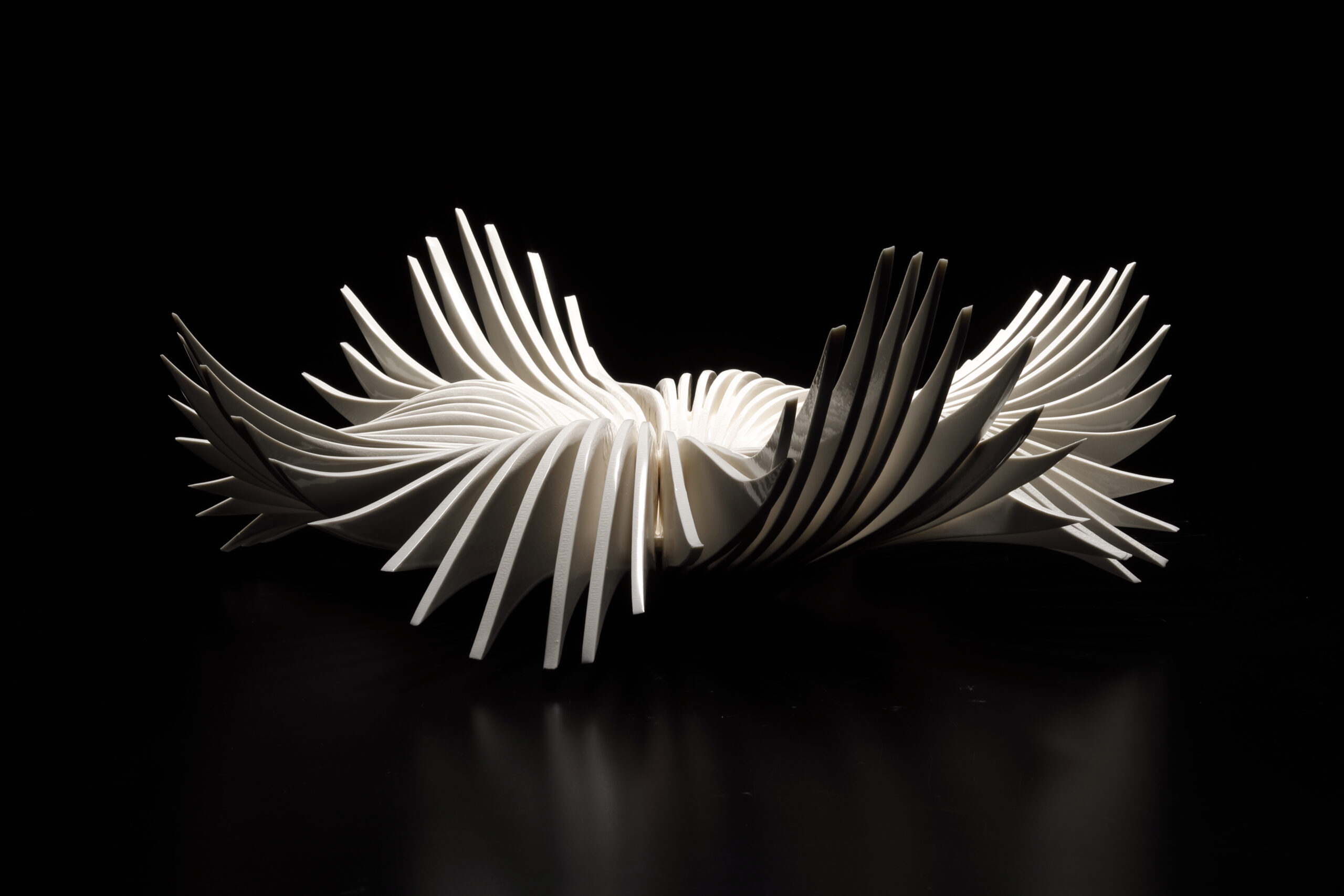 そのアートからBone Flower Luminousは生まれた。アルミニウム金属板に研磨加工を何度も行うことで独特な光沢を得たのちに、アルマイト処理(陽極酸化処理)で生成した多孔質皮膜に、金属塩を含む電解液中で電気分解を行い、皮膜の孔の中に金属や金属化合物を析出させて着色する、いわゆる電解着色を施し、対候性を高めた。隣り合う金属片を互いに緊結させ、最終的に全てが支え合うことで作品は構造的に自立している。