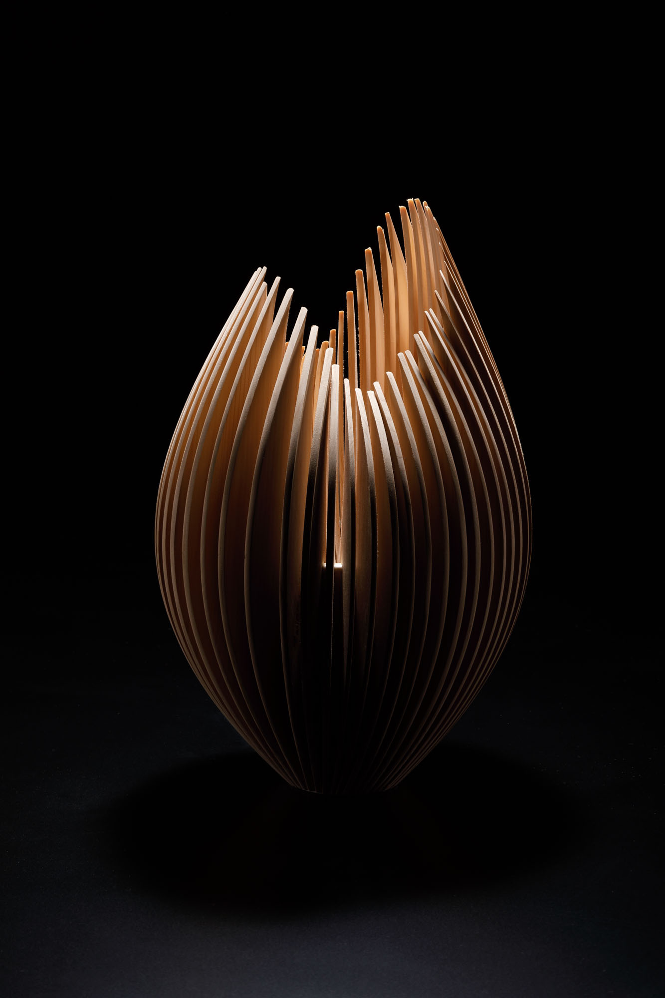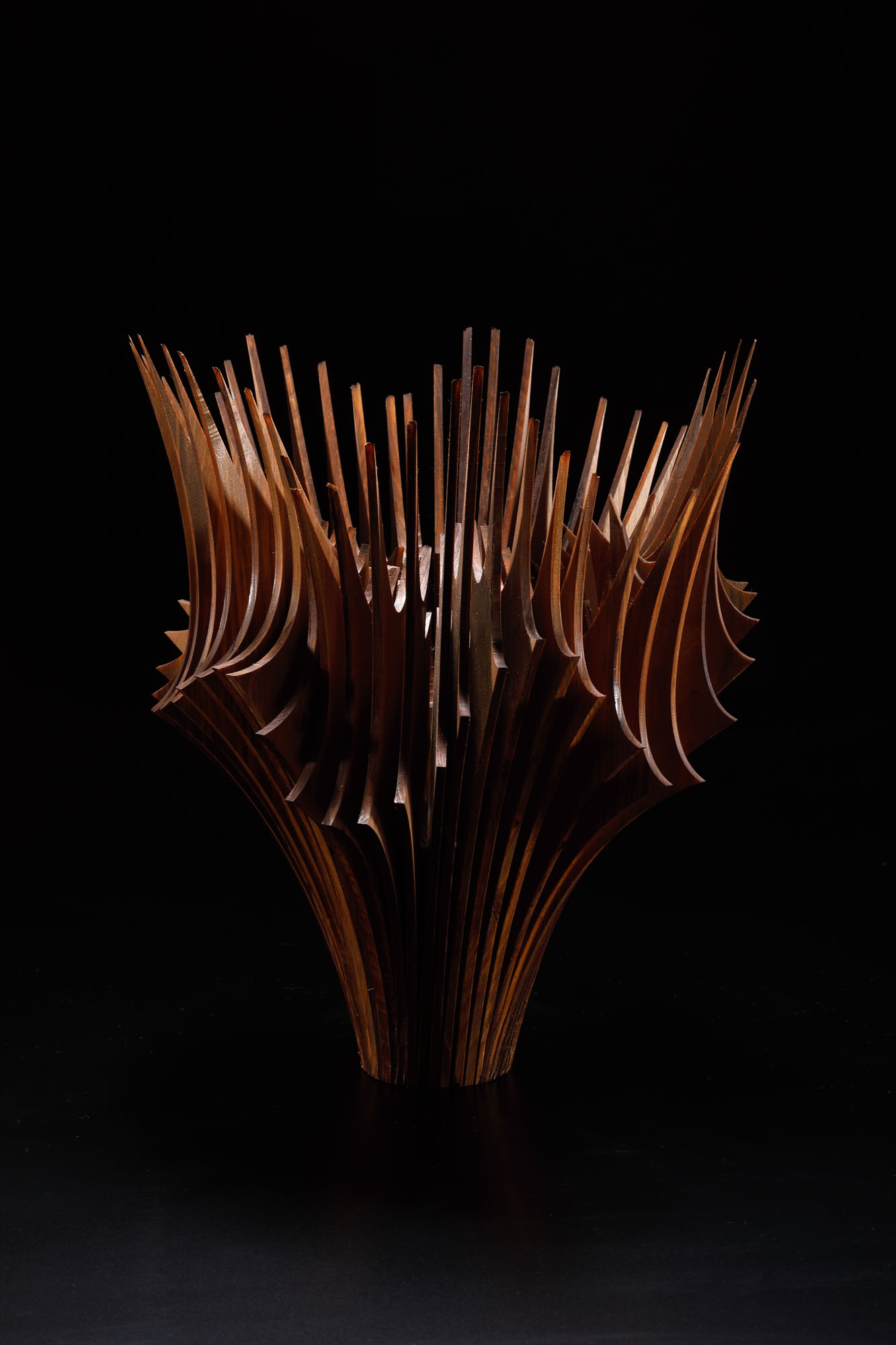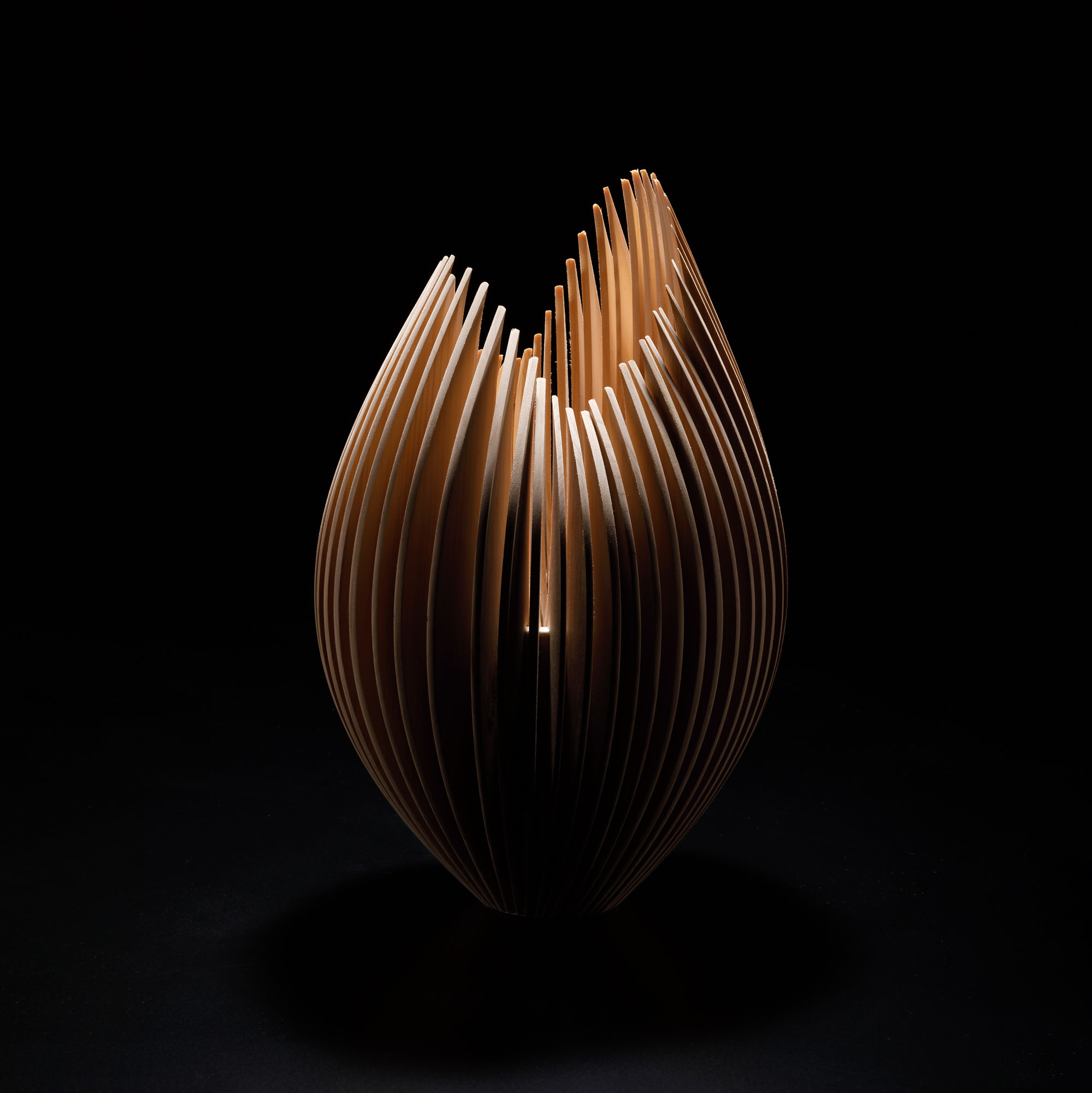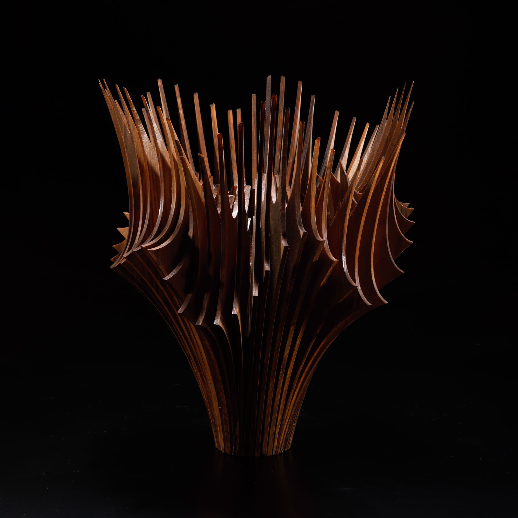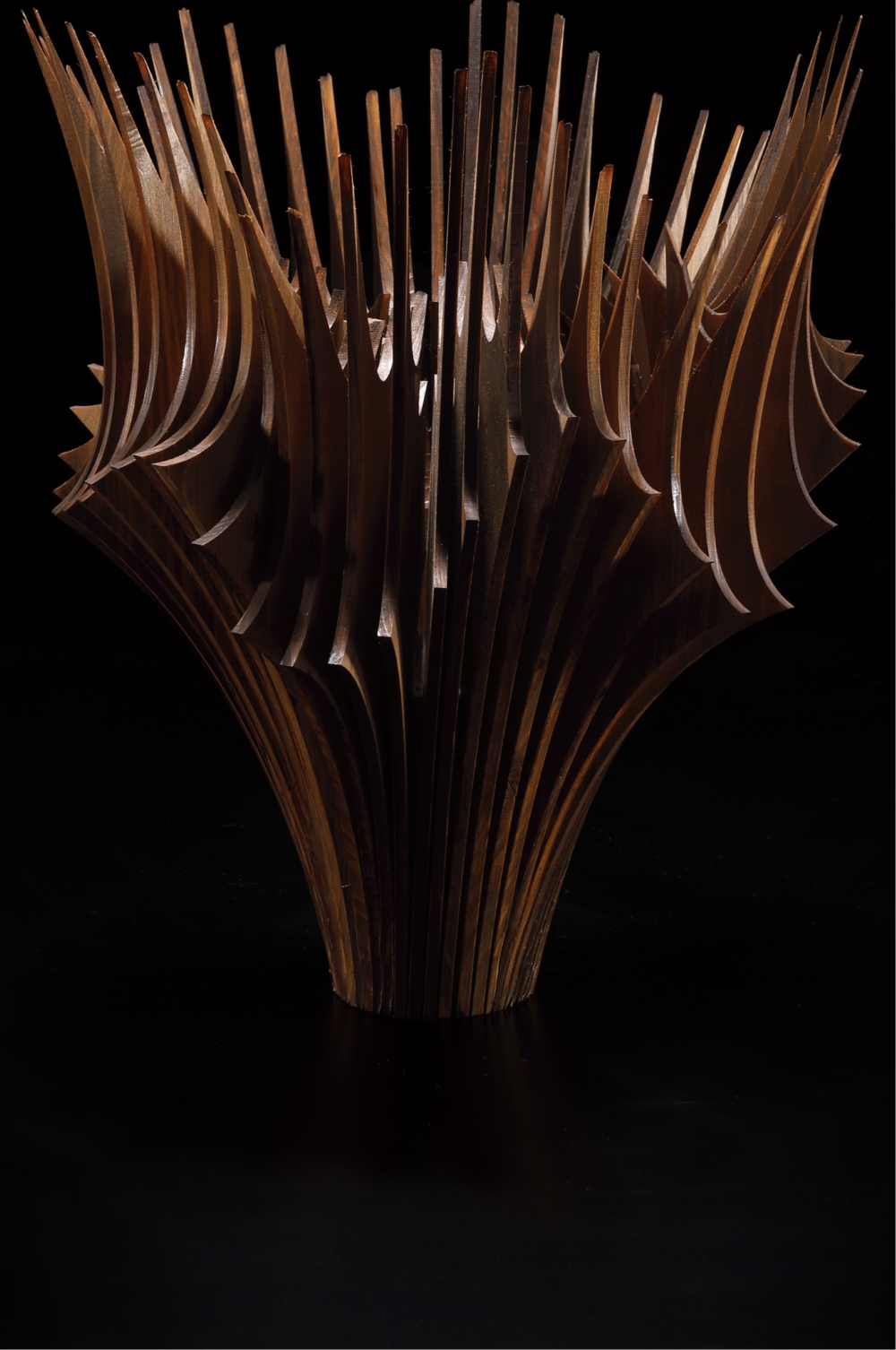 大自然の営み、人知では計り知れない自然現象を前に、原始・古代の人々は驚き、恐れ、感動を繰り返したに違いありません。そしてそこに「見えない力」を感じとったのです。それが「精霊」であり「神」です。やがて、彼らは社会の安定と維持のため「神」を祀り、「神話」を生み、神々と交歓する儀礼を独自に発達させていきました。原始・古代の人々が遺した縄文土器を始めとする「祈りの器」は、私たち現代人にはその意味や使い方すら理解できないものも多数存在します。 2024年元旦の能登半島地震は我が家に甚大な被害をもたらしました。時を経て、人と自然の関わり方を深く考えるようになりました。現代における「祈器」を創りたい。その「祈器」を故郷に捧げたい。地震によって廃棄せざるを得ない石川県が誇る県産材「能登ヒバ」を譲って頂いて、それらをゆっくり乾燥させて、ヤスリで磨き続けて、漆で着色し、接着。石川の伝統工芸とBone Flowerの融合です。