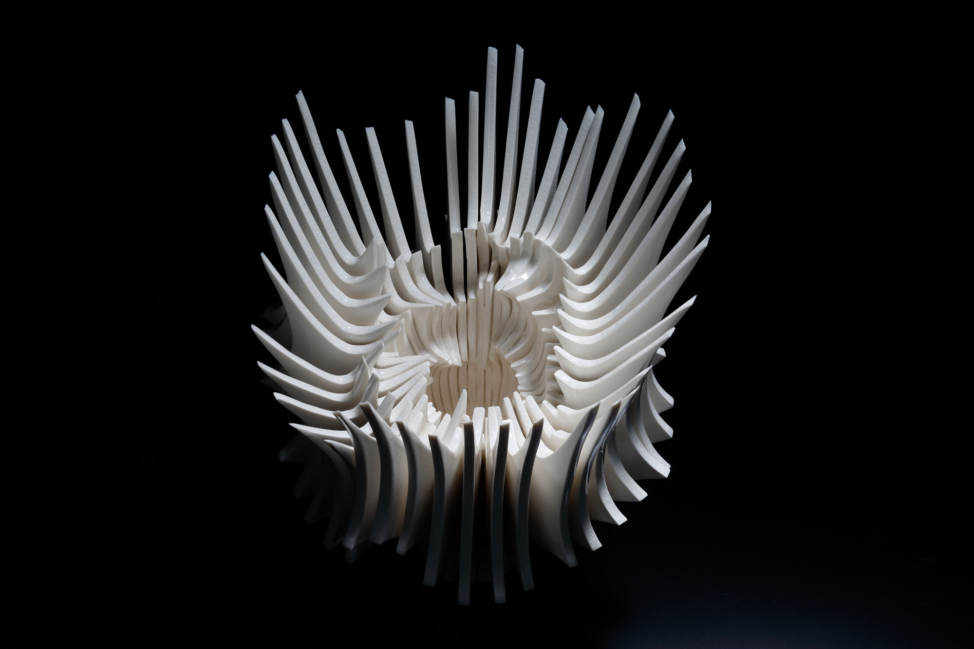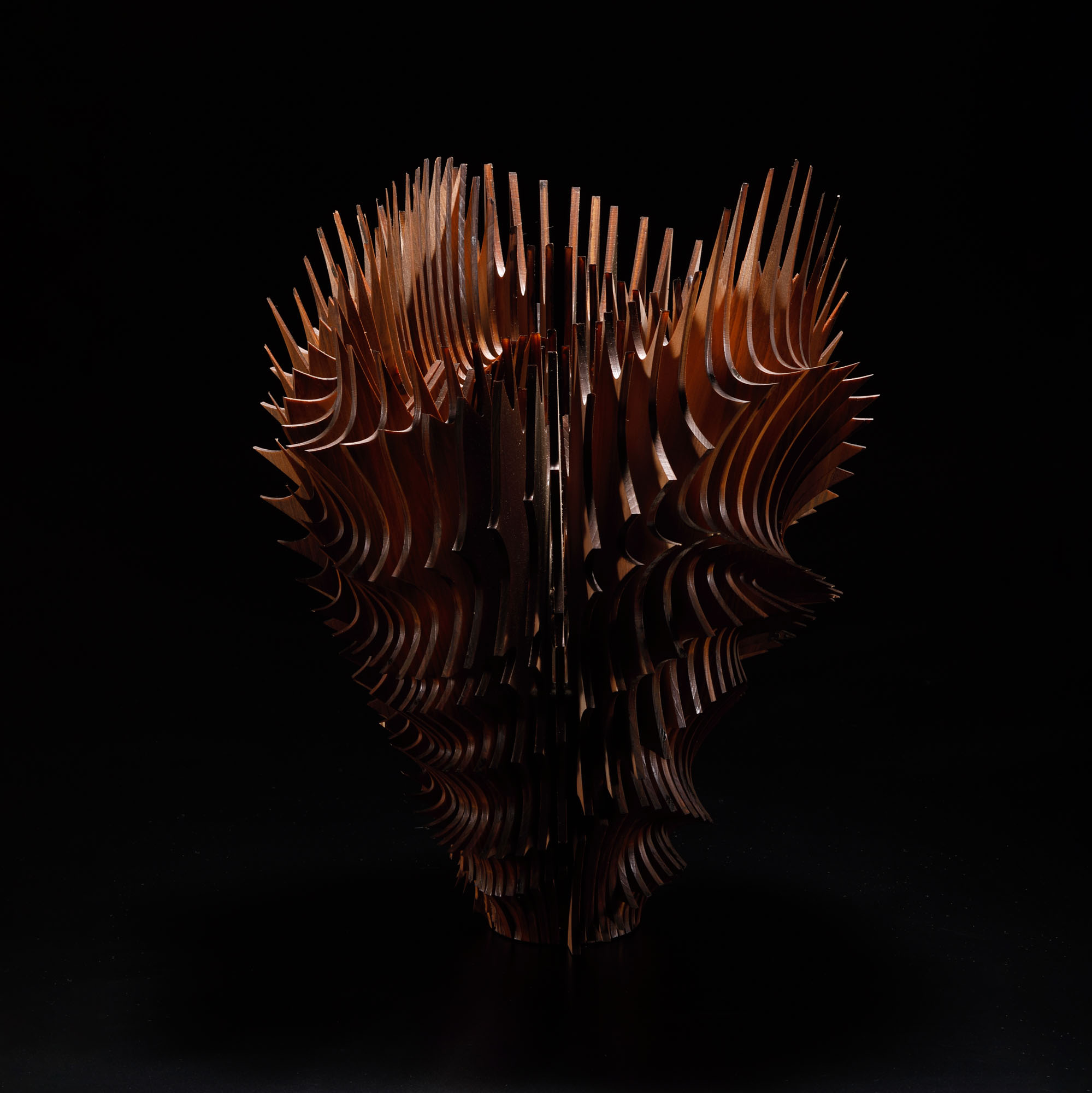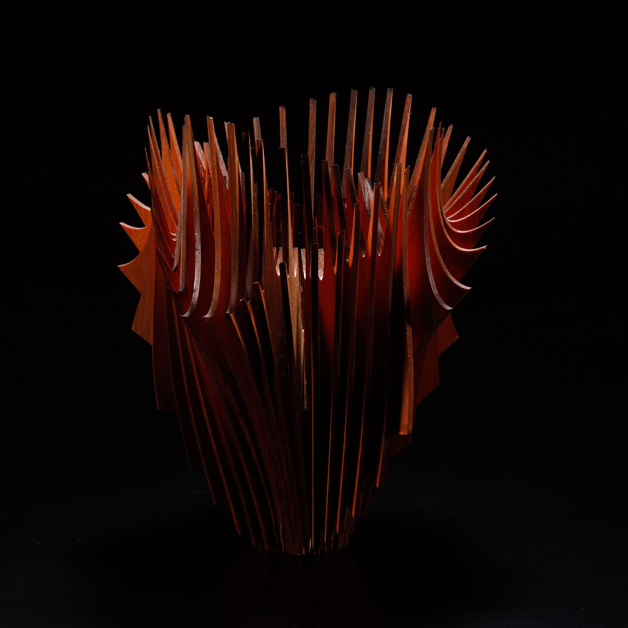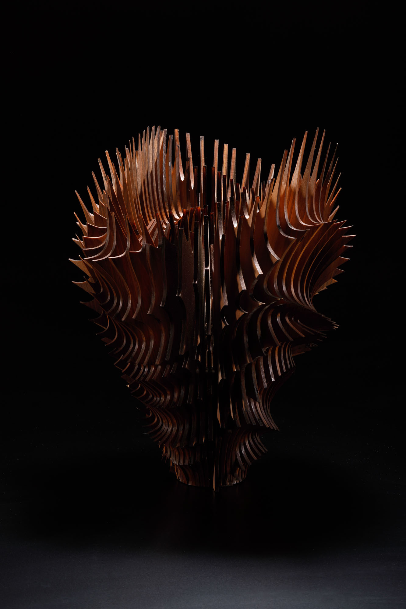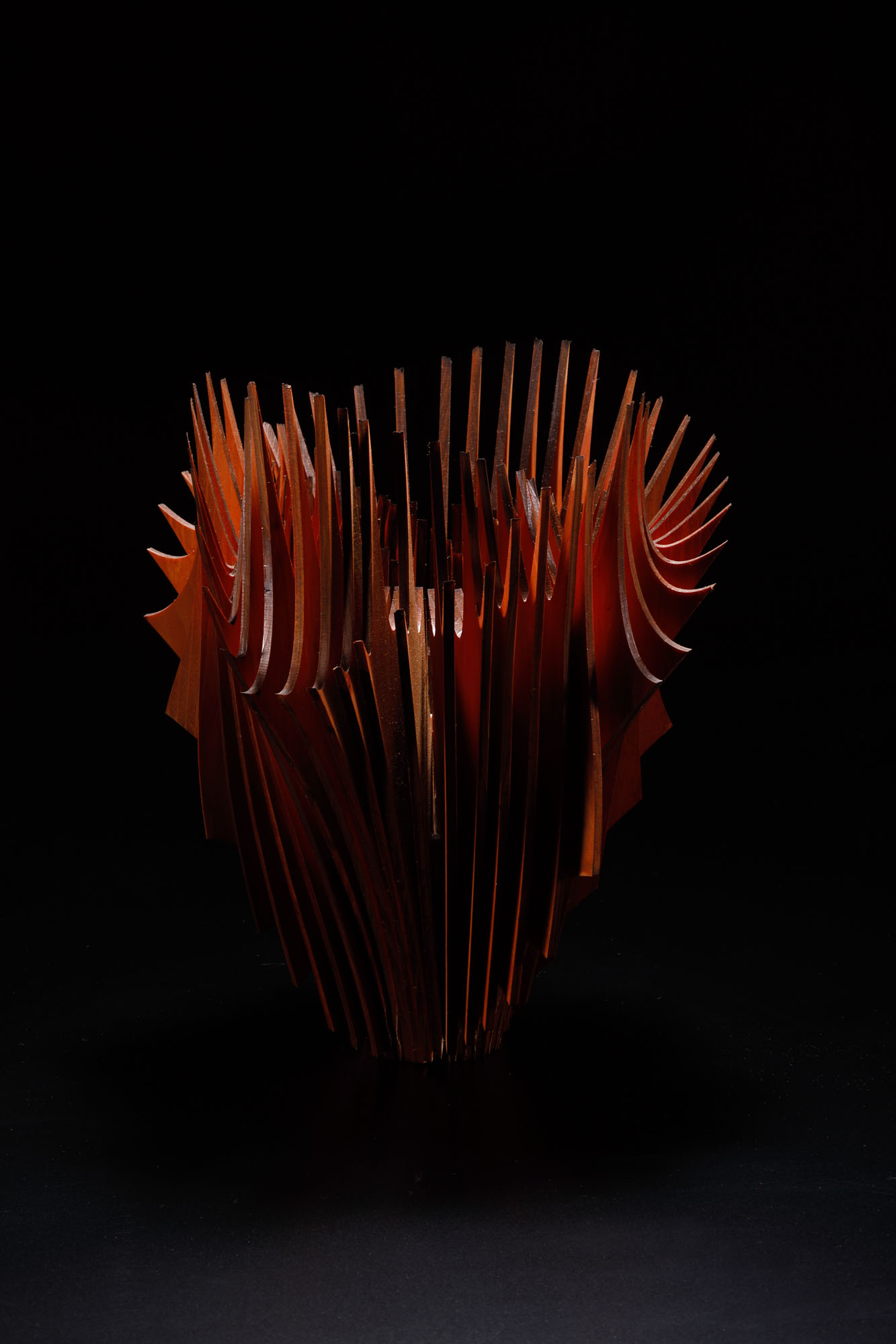 大自然の営み、人知では計り知れない自然現象を前に、原始・古代の人々は驚き、恐れ、感動を繰り返したに違いありません。そしてそこに「見えない力」を感じとったのです。それが「精霊」であり「神」です。やがて、彼らは社会の安定と維持のため「神」を祀り、「神話」を生み、神々と交歓する儀礼を独自に発達させていきました。原始・古代の人々が遺した縄文土器を始めとする「祈りの器」は、私たち現代人にはその意味や使い方すら理解できないものも多数存在します。 2024年元旦の能登半島地震は我が家に甚大な被害をもたらしました。時を経て、人と自然の関わり方を深く考えるようになりました。現代における「祈器」を創りたい。その「祈器」を故郷に捧げたい。地震によって廃棄せざるを得ない石川県が誇る県産材「能登ヒバ」を譲って頂いて、それらをゆっくり乾燥させて、ヤスリで磨き続けて、漆で着色し、接着。石川の伝統工芸とBone Flowerの融合です。