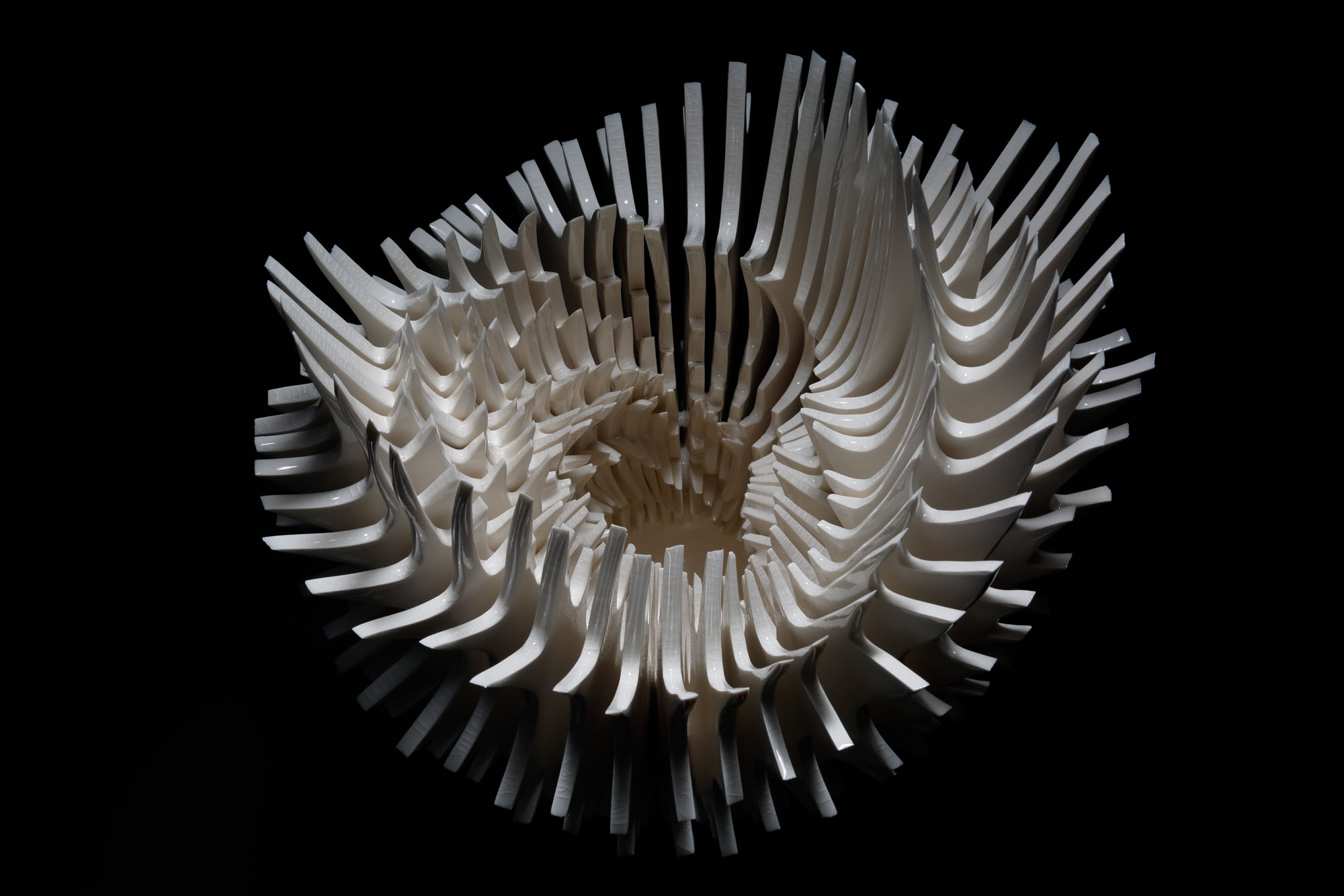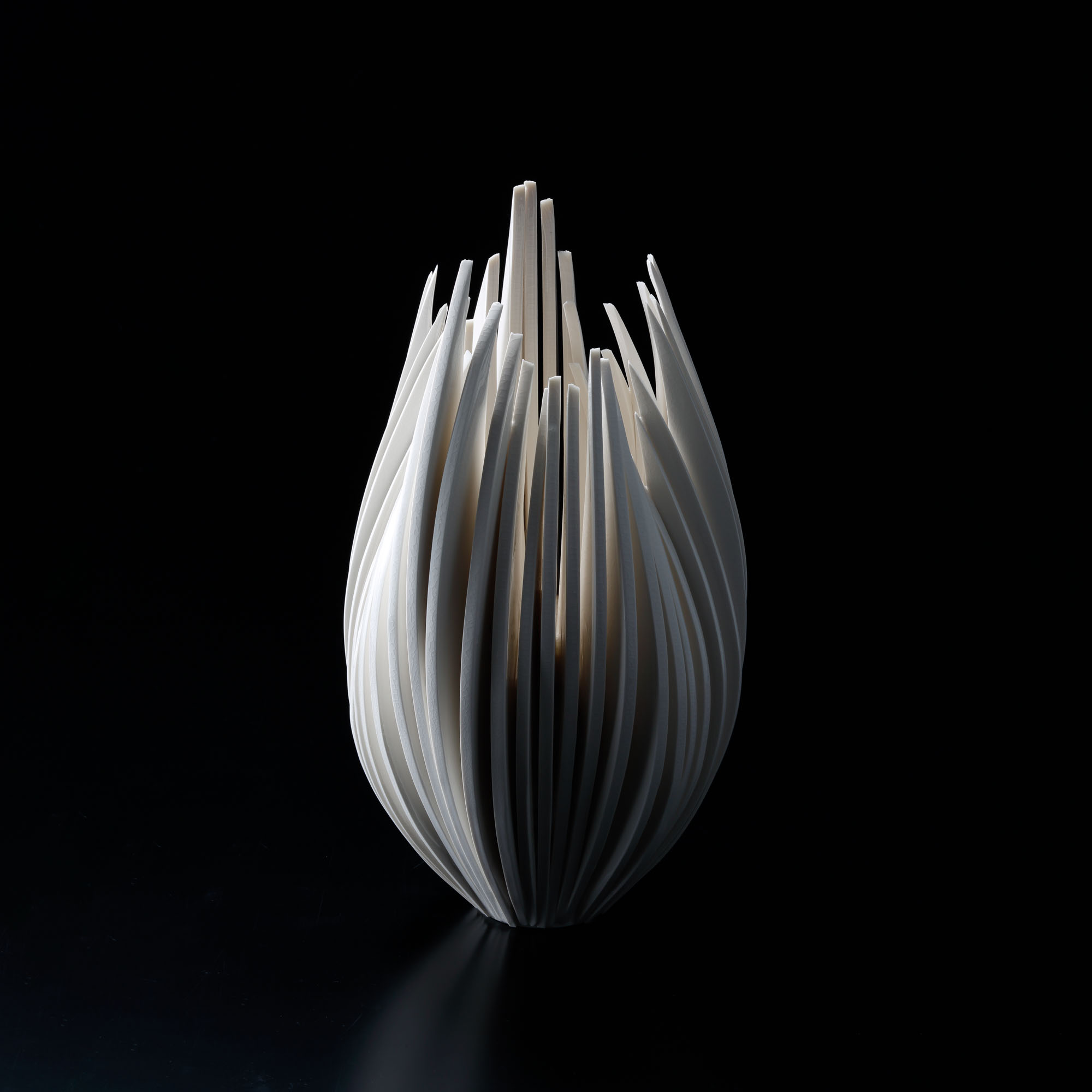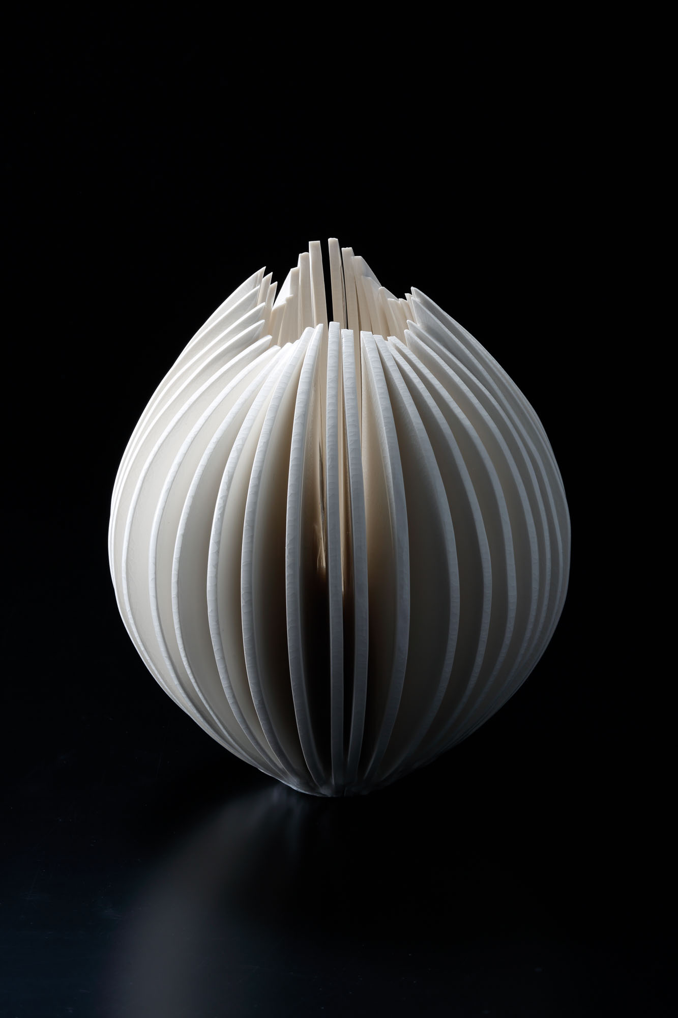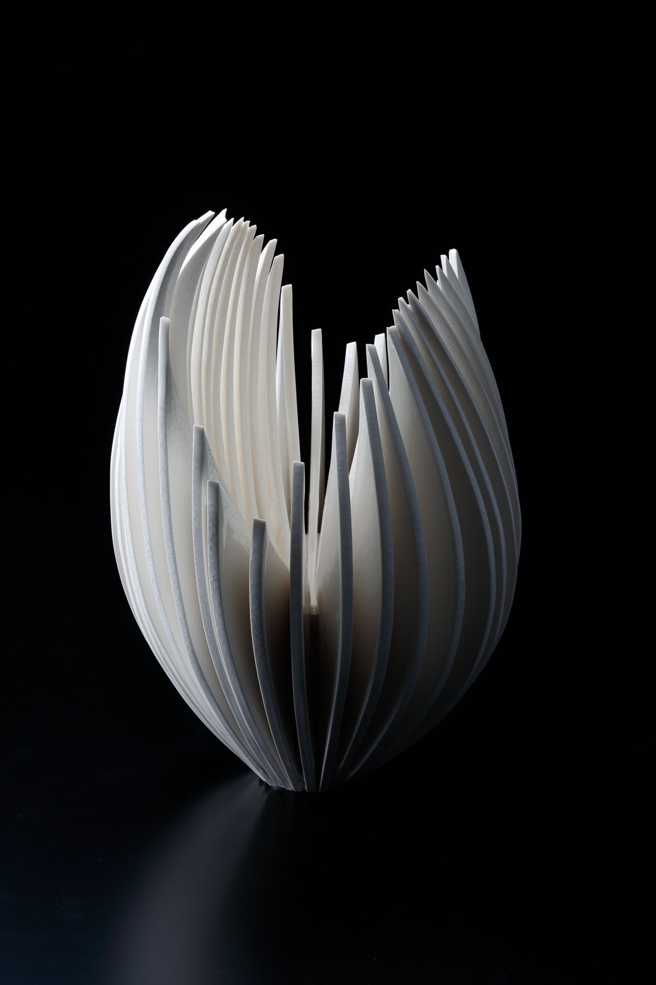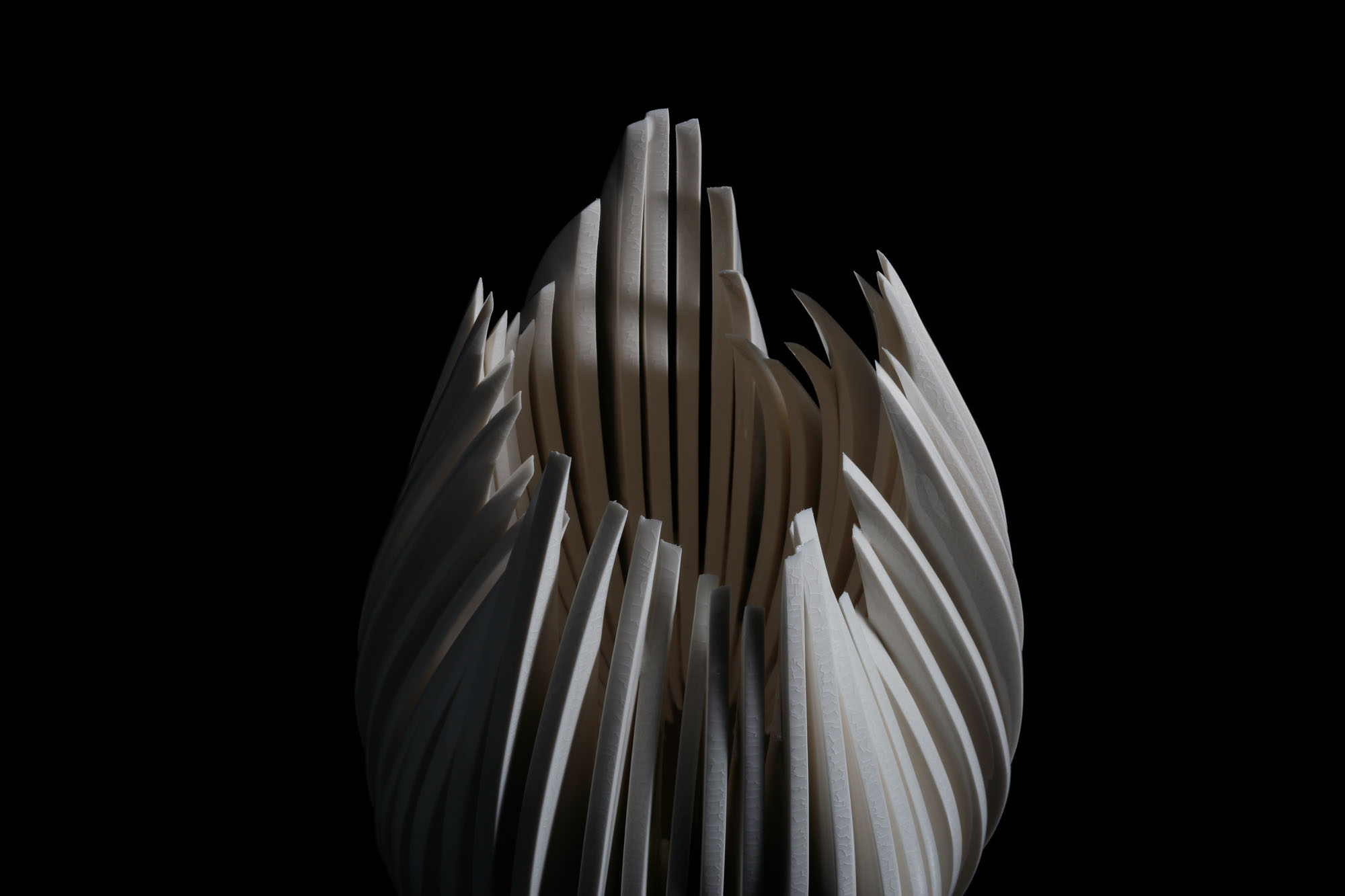 大自然の営み、人知では計り知れない自然現象を前に、原始・古代の人々は驚き、恐れ、感動を繰り返したに違いありません。そしてそこに「見えない力」を感じとったのです。それが「精霊」であり「神」です。やがて、彼らは社会の安定と維持のため「神」を祀り、「神話」を生み、神々と交歓する儀礼を独自に発達させていきました。原始・古代の人々が遺した縄文土器を始めとする「祈りの器」は、私たち現代人にはその意味や使い方すら理解できないものも多数存在します。 2024年元旦の能登半島地震は我が家に甚大な被害をもたらしました。時を経て、人と自然の関わり方を深く考えるようになりました。現代における「祈器」を創りたい。その「祈器」を故郷に捧げたい。地震によって廃棄せざるを得ない石川県が誇る県産材「能登ヒバ」を譲って頂いて、それらをゆっくり乾燥させて、ヤスリで磨き続けて、漆で着色し、接着。石川の伝統工芸とBone Flowerの融合です。