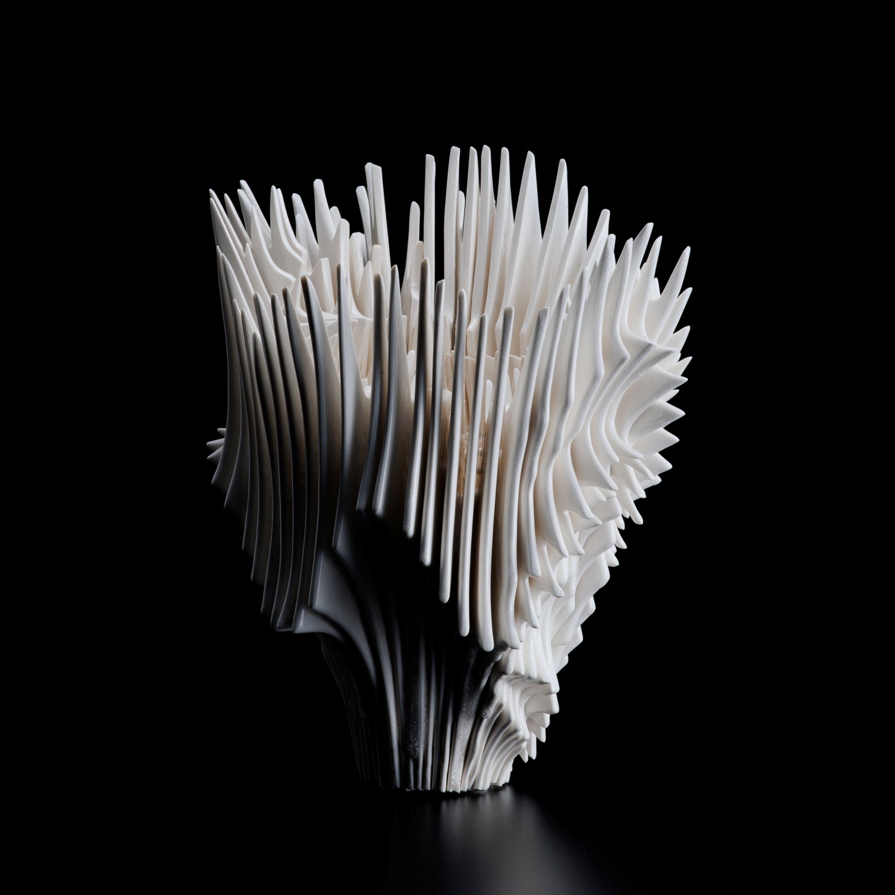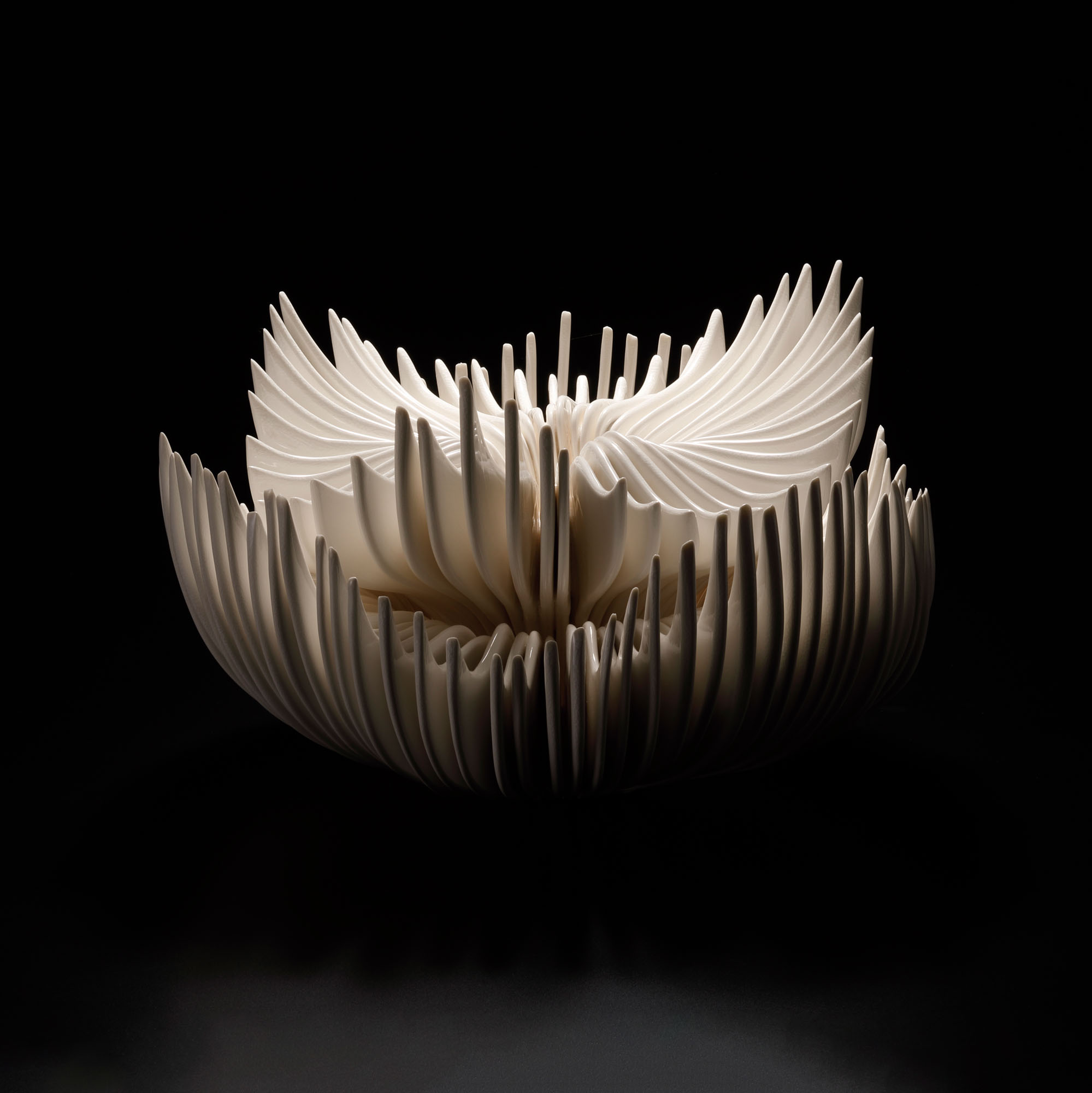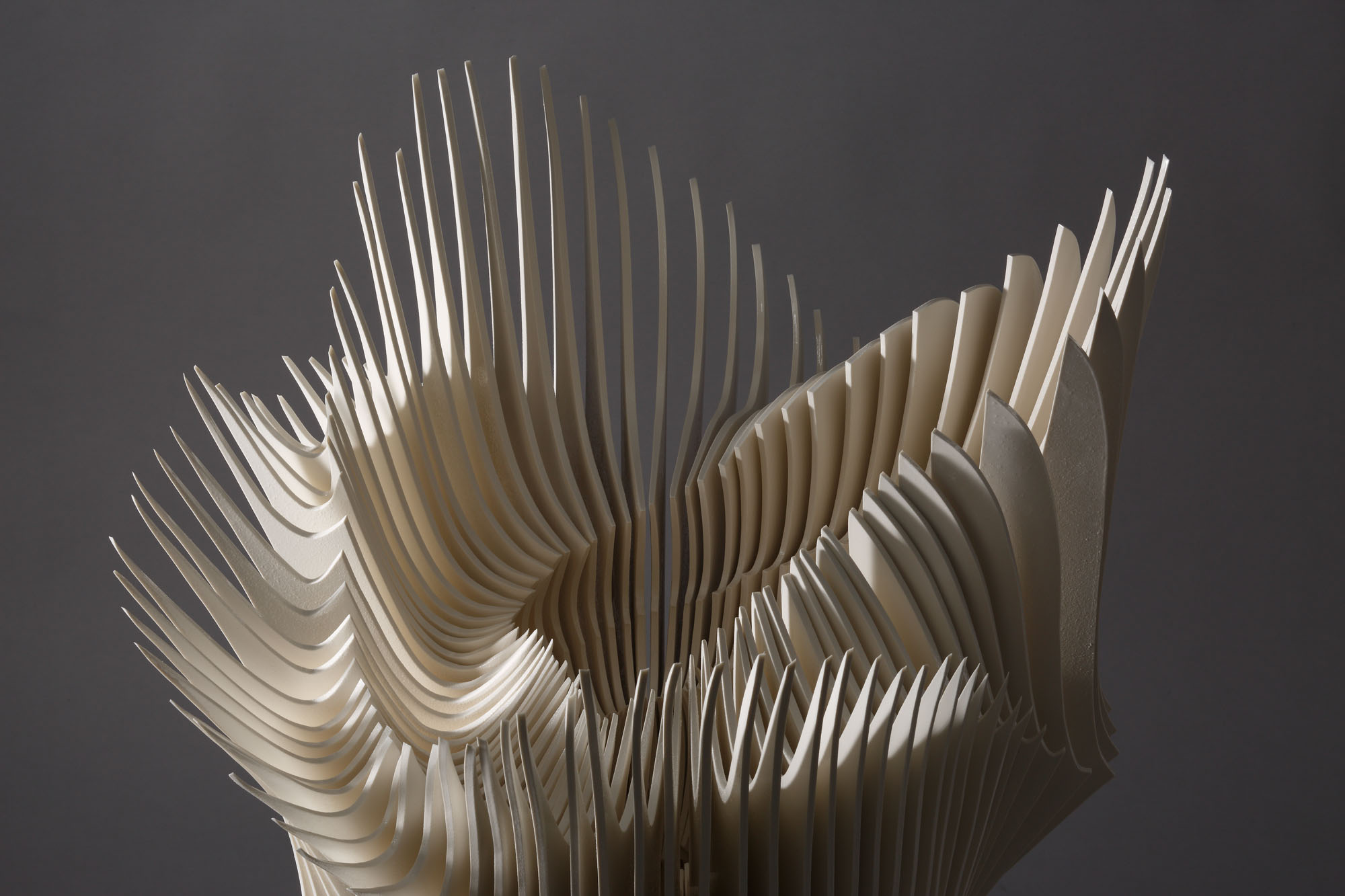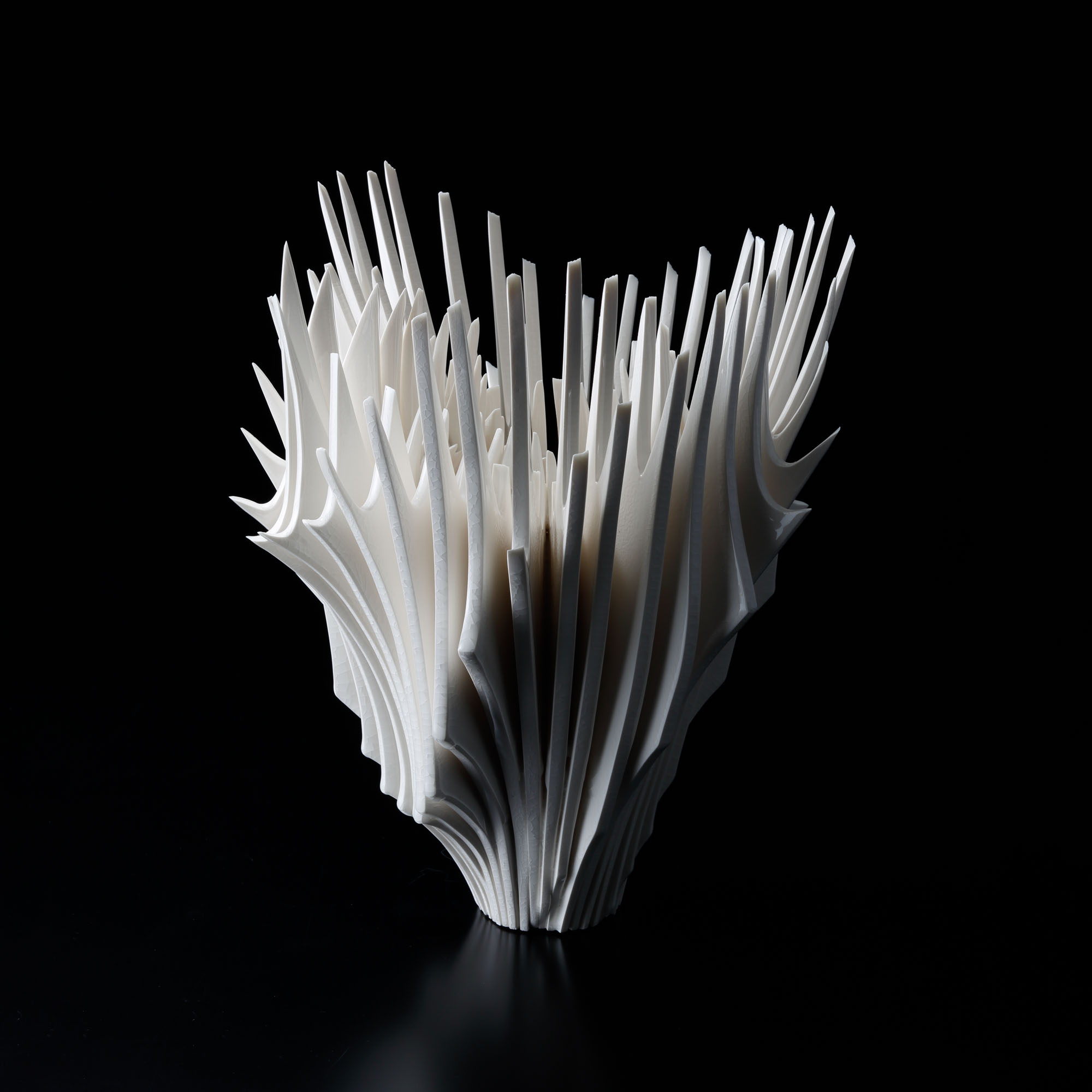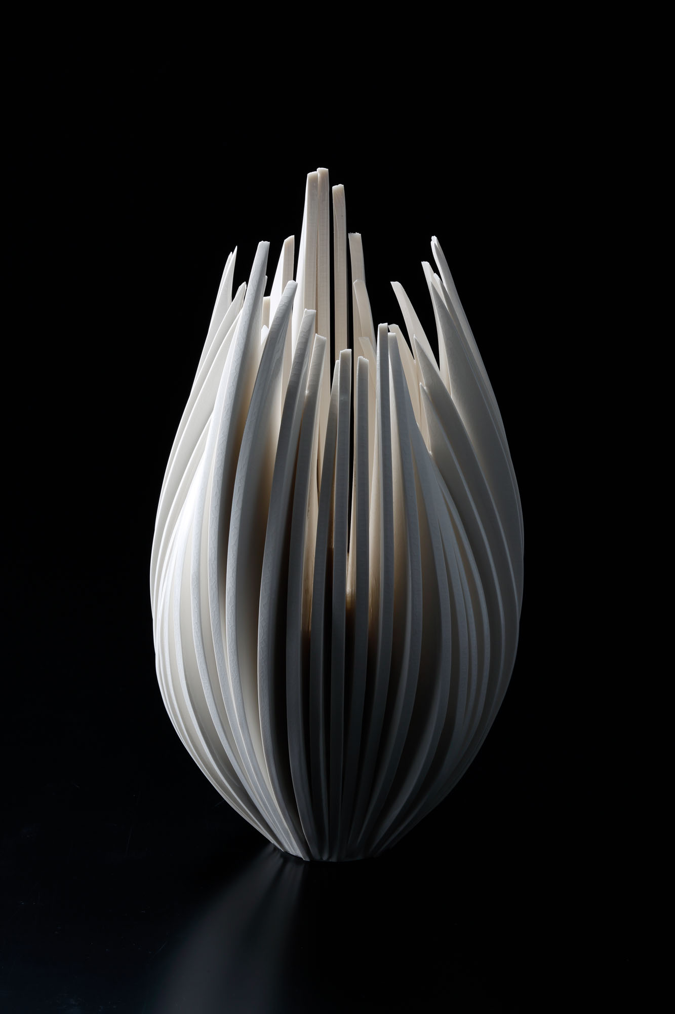 大自然の営み、人知では計り知れない自然現象を前に、原始・古代の人々は驚き、恐れ、感動を繰り返したに違いありません。そしてそこに「見えない力」を感じとったのです。それが「精霊」であり「神」です。やがて、彼らは社会の安定と維持のため「神」を祀り、「神話」を生み、神々と交歓する儀礼を独自に発達させていきました。原始・古代の人々が遺した縄文土器を始めとする「祈りの器」は、私たち現代人にはその意味や使い方すら理解できないものも多数存在します。 2024年元旦の能登半島地震は我が家に甚大な被害をもたらしました。時を経て、人と自然の関わり方を深く考えるようになりました。現代における「祈器」を創りたい。その「祈器」を故郷に捧げたい。地震によって廃棄せざるを得ない石川県が誇る県産材「能登ヒバ」を譲って頂いて、それらをゆっくり乾燥させて、ヤスリで磨き続けて、漆で着色し、接着。石川の伝統工芸とBone Flowerの融合です。