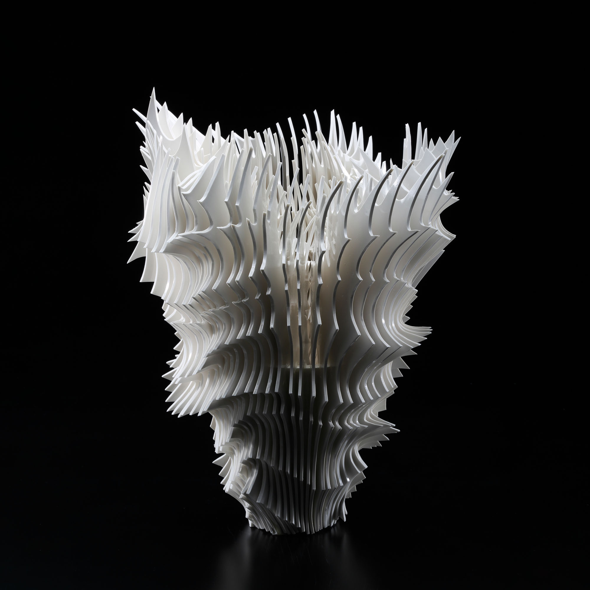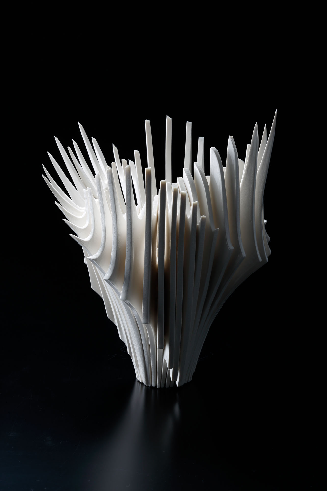 In the face of the workings of Mother Nature and natural phenomena beyond human understanding, primitive and ancient people must have been surprised, frightened, and moved repeatedly. And they sensed an “invisible power” there. That is “spirit” and “god”. Eventually, they worshiped “gods” to stabilize and maintain society, created “myths,” and developed their own rituals to interact with the gods. There are many “prayer vessels” such as Jomon pottery left behind by primitive and ancient people, and we modern people cannot even understand their meaning or how to use them. The Noto Peninsula earthquake on New Year’s Day 2024 caused severe damage to my home. Over time, I began to think deeply about the relationship between people and nature. I want to create a “prayer vessel” for the modern era. I want to dedicate that “prayer vessel” to my hometown. I was given “Noto Hiba”, a local material that Ishikawa Prefecture is proud of, which had to be discarded due to the earthquake, and I slowly dried them, polished them with sandpaper, colored them with lacquer, and glued them together. It is a fusion of Ishikawa’s traditional crafts and Bone Flower.