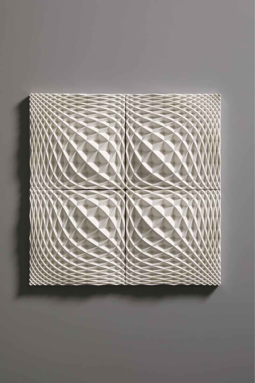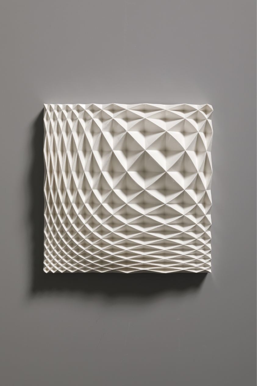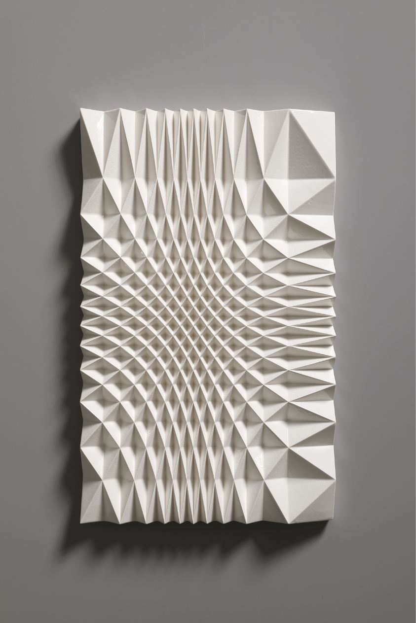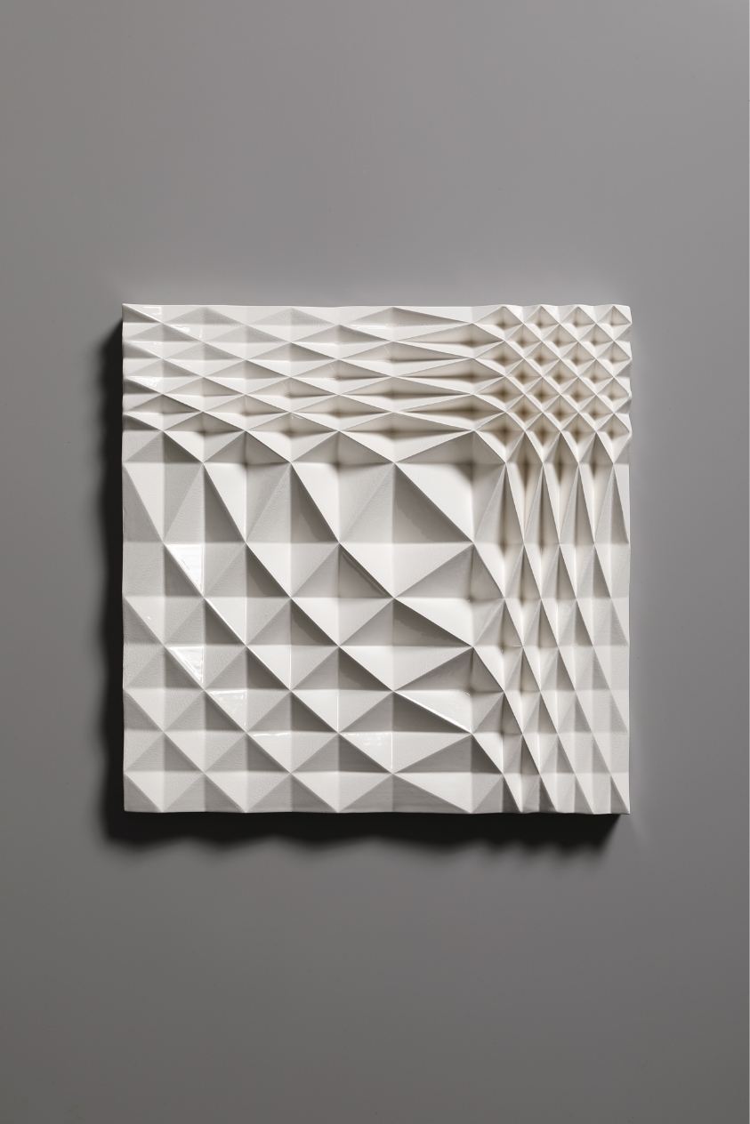 The Ice Wall series represents a new form of art that was born out of a fusion of ceramics and cutting-edge technology. Nara’s works are inspired by the artist’s experience of the vast snowy landscapes of Kanazawa, where he spent his childhood. With a strangely fluctuating quality somewhere between two- and three-dimensional, and between line and surface, every piece radiates an exquisite geometrical beauty that is taken to an almost sublime level thanks to the generous use of glaze.
