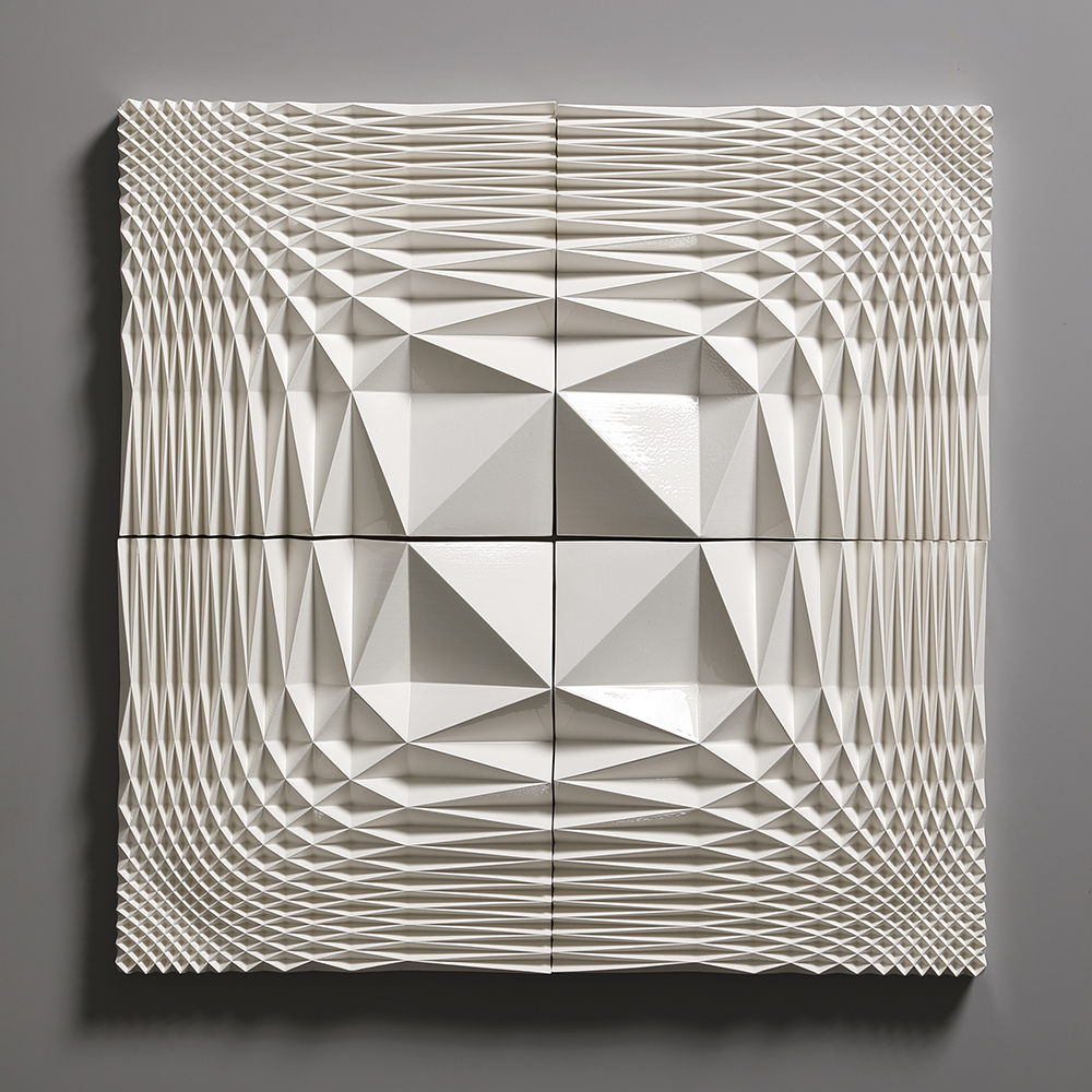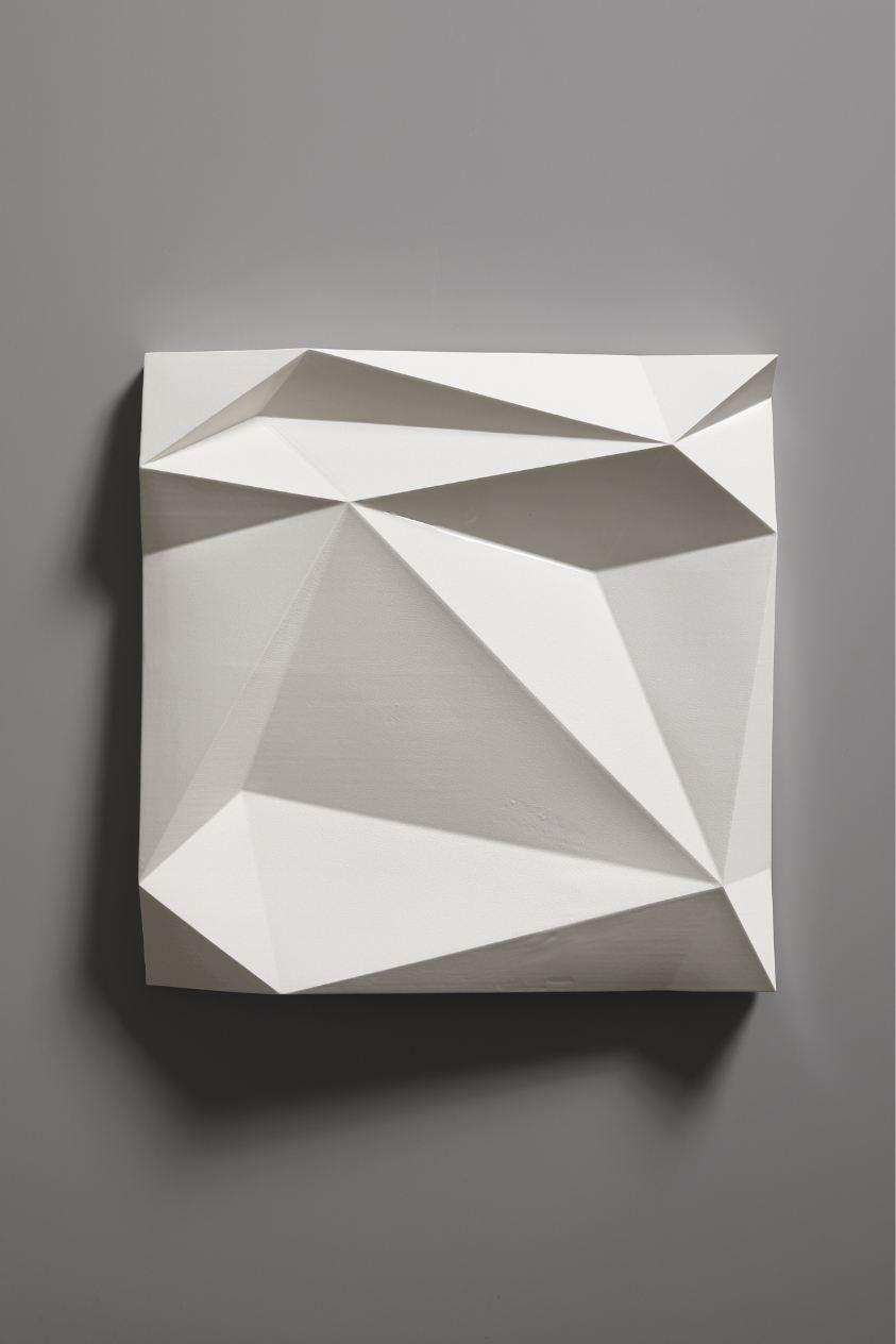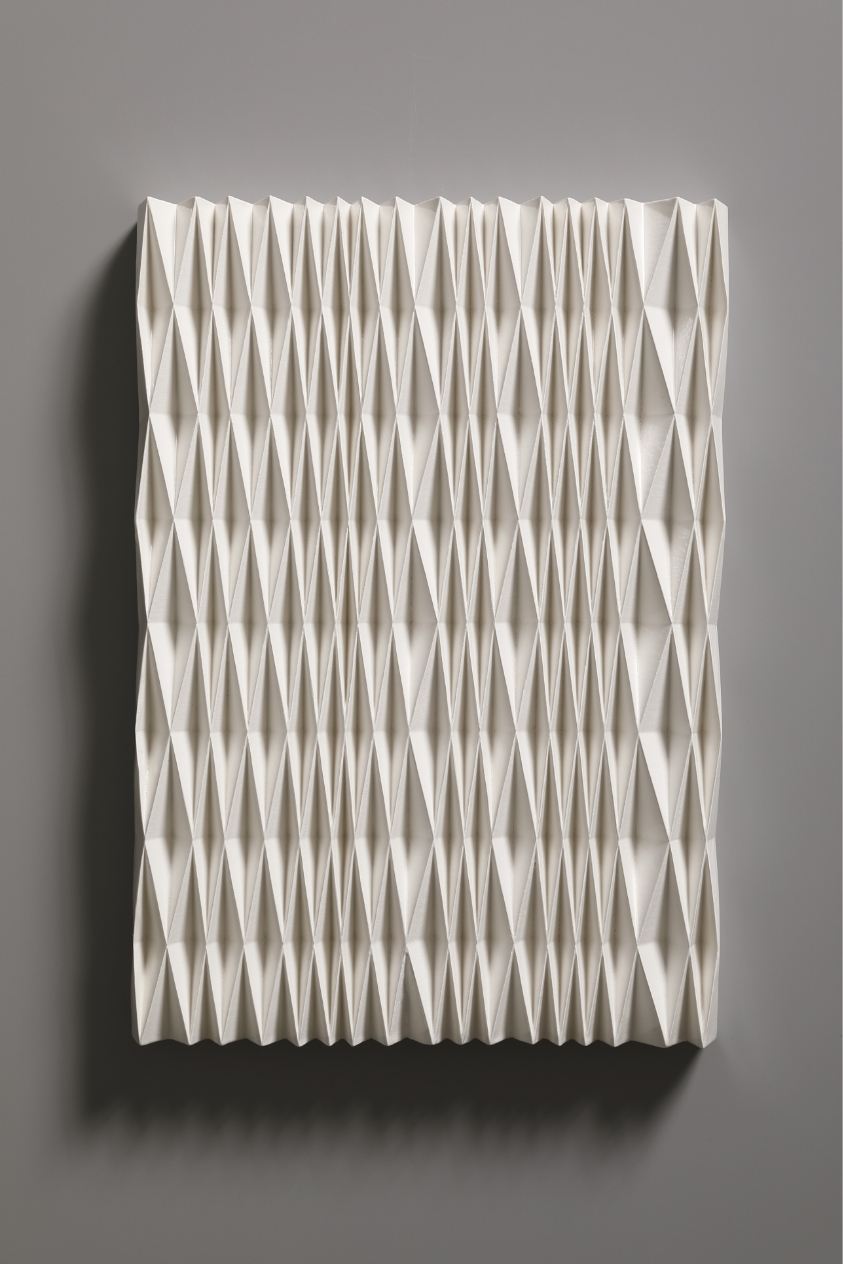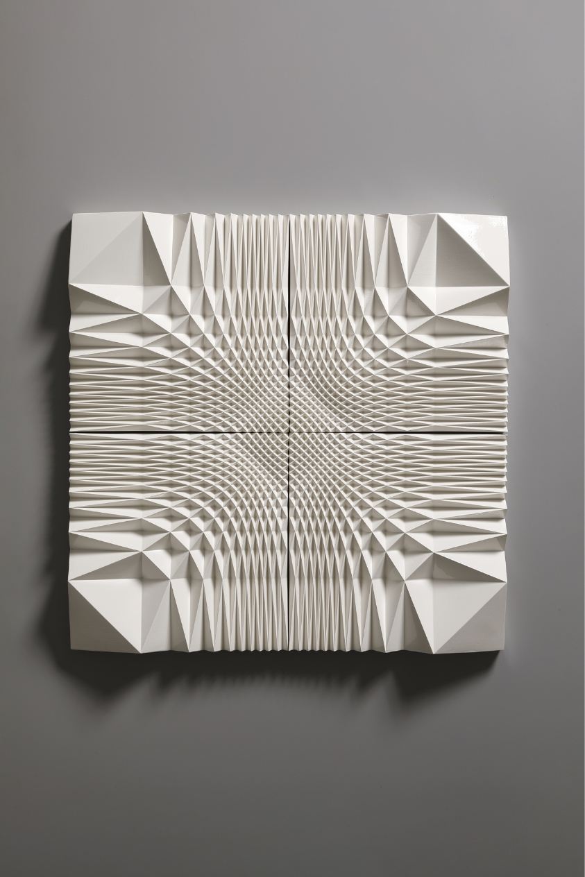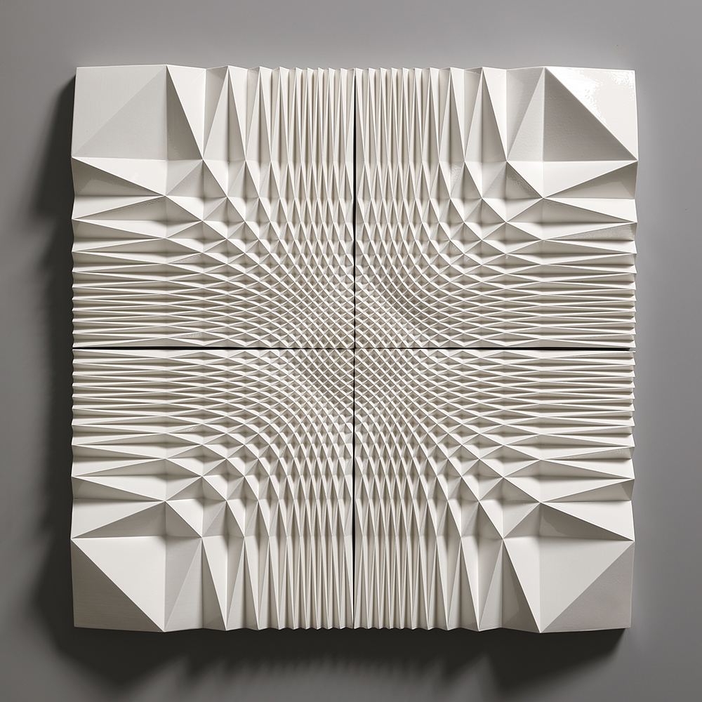 The Ice Wall series represents a new form of art that was born out of a fusion of ceramics and cutting-edge technology. Nara’s works are inspired by the artist’s experience of the vast snowy landscapes of Kanazawa, where he spent his childhood. With a strangely fluctuating quality somewhere between two- and three-dimensional, and between line and surface, every piece radiates an exquisite geometrical beauty that is taken to an almost sublime level thanks to the generous use of glaze.