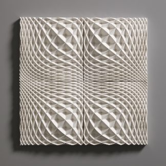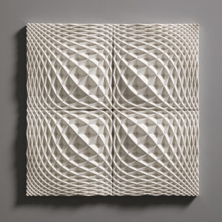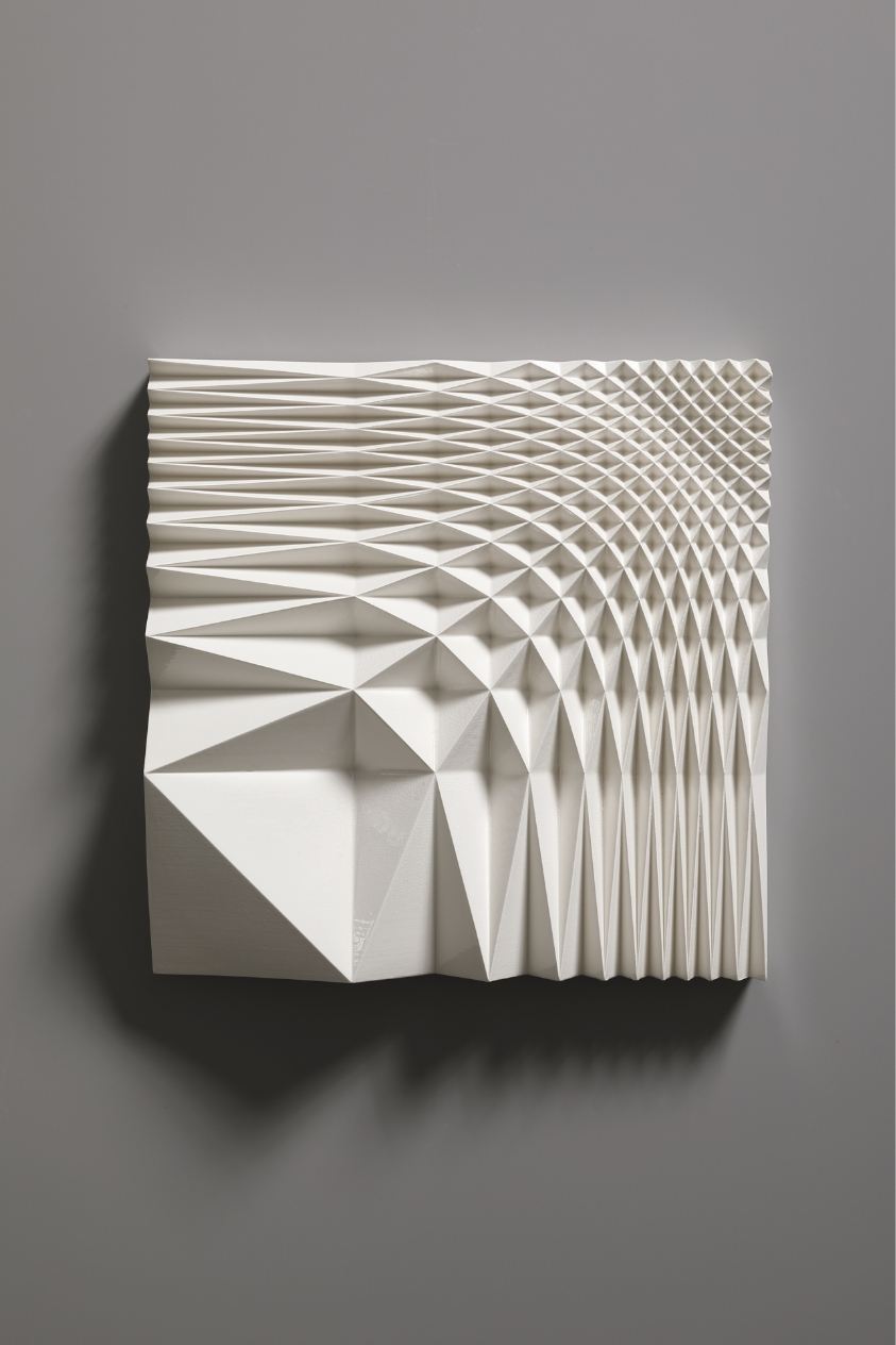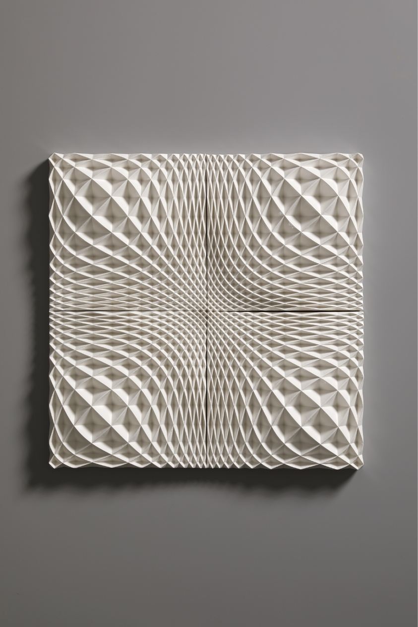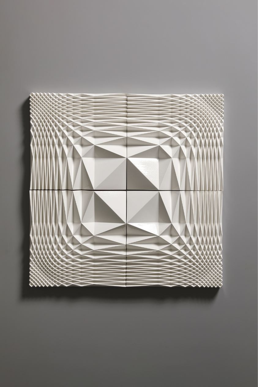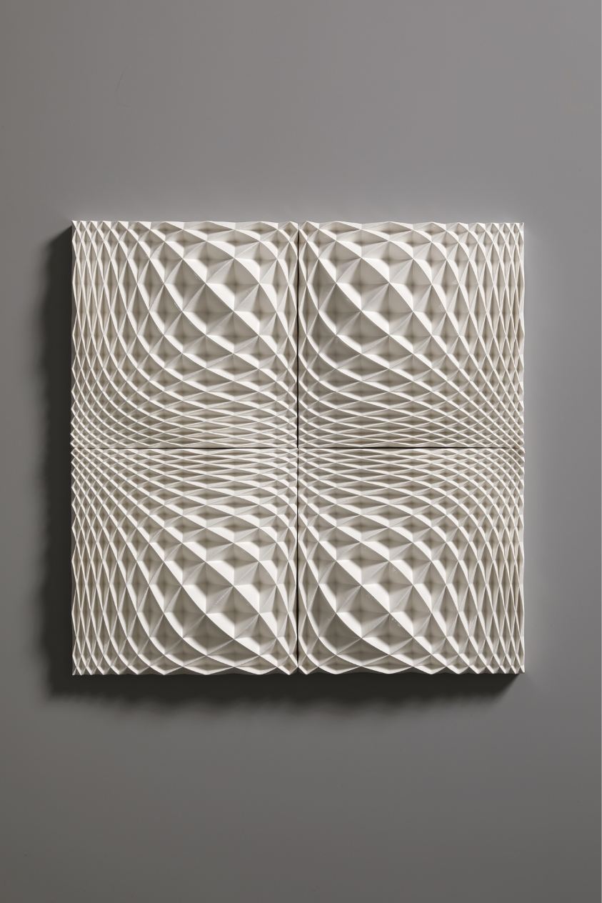 The Ice Wall series represents a new form of art that was born out of a fusion of ceramics and cutting-edge technology. Nara’s works are inspired by the artist’s experience of the vast snowy landscapes of Kanazawa, where he spent his childhood. With a strangely fluctuating quality somewhere between two- and three-dimensional, and between line and surface, every piece radiates an exquisite geometrical beauty that is taken to an almost sublime level thanks to the generous use of glaze.