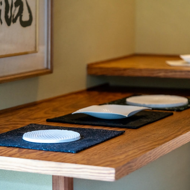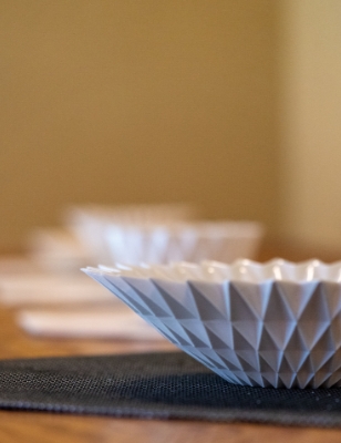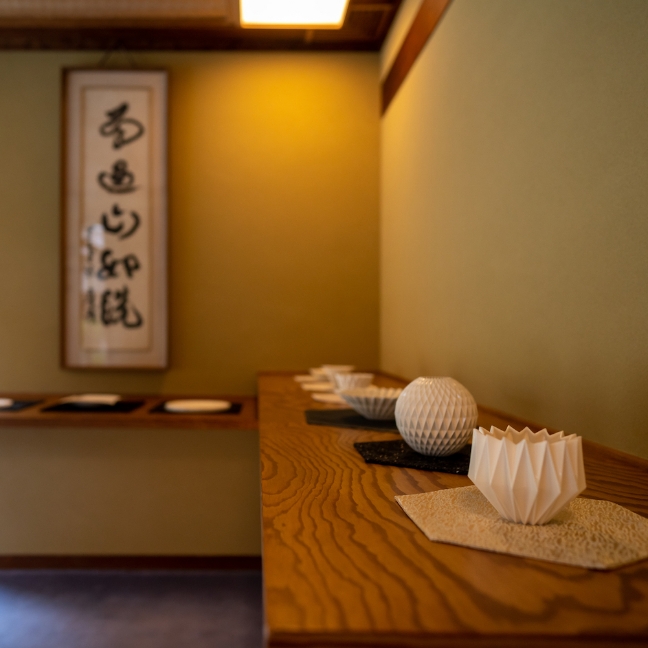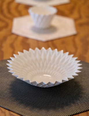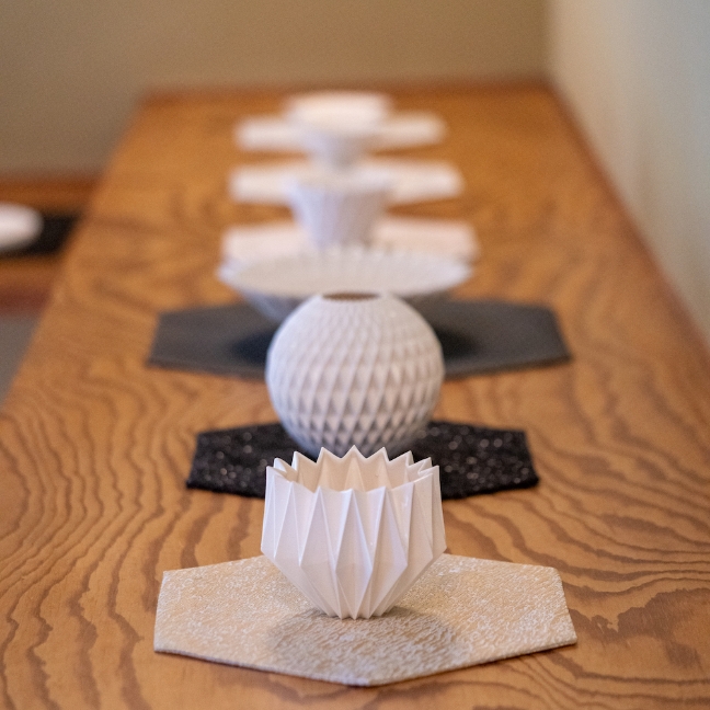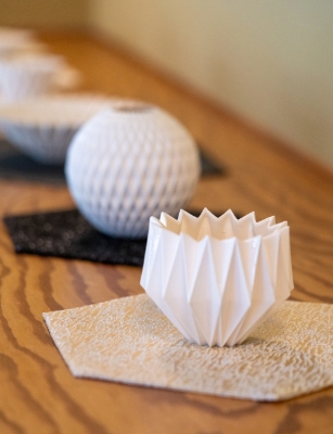 「Lotus」は、細尾が手がける最先端の西陣織のテキスタイルにインスピレーションを受けたもの。細尾の工房を訪れた時、フラットだと思っていた西陣織が実は何層ものレイヤーが重なった立体構造だったことに驚いたことが発端だ。作品は、織物にも折り紙にも見える。一連の長い制作プロセスが、泥からすっと茎を伸ばし美しい花を咲かせる蓮の成長の軌跡に重なり、「Lotus」と名付けた。