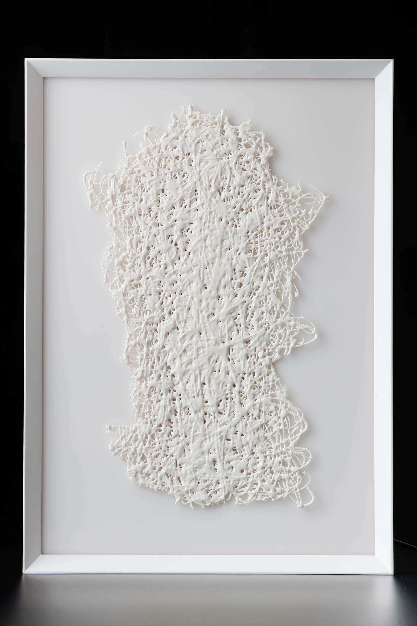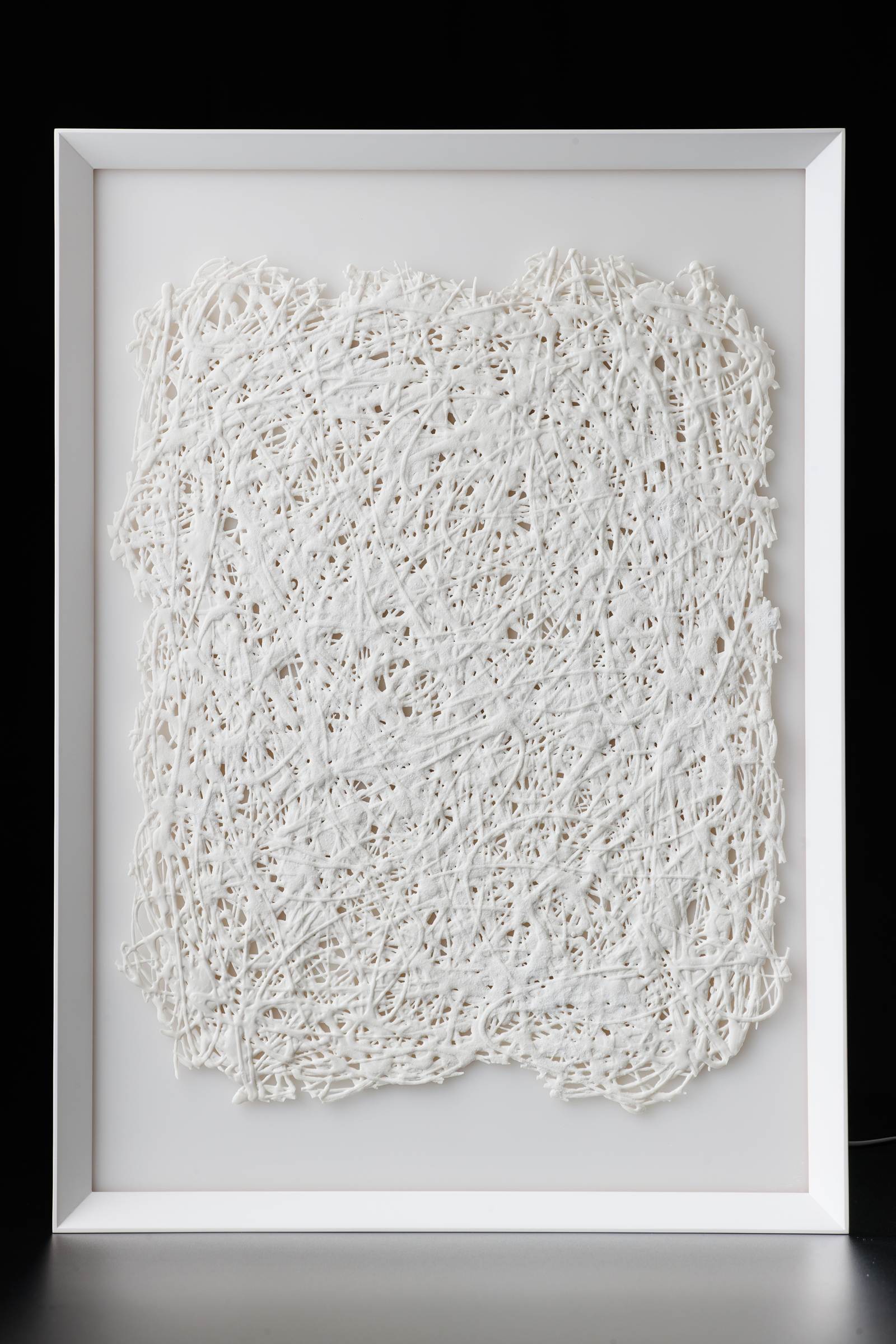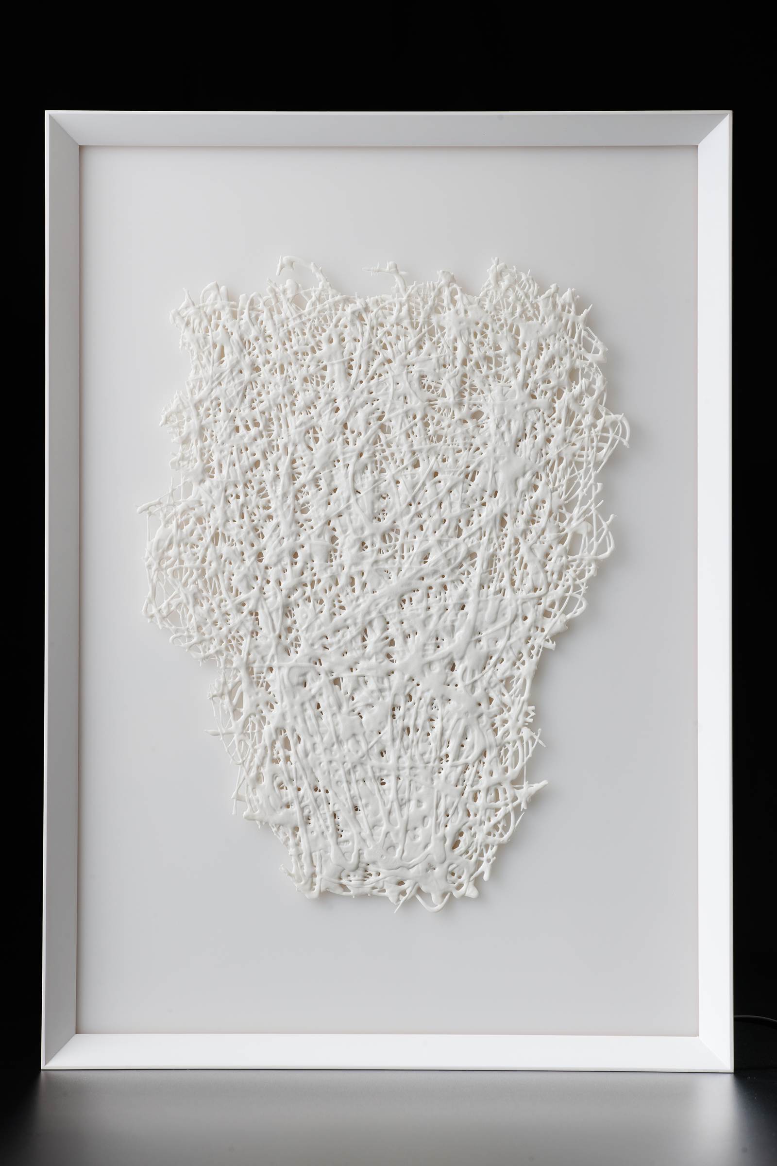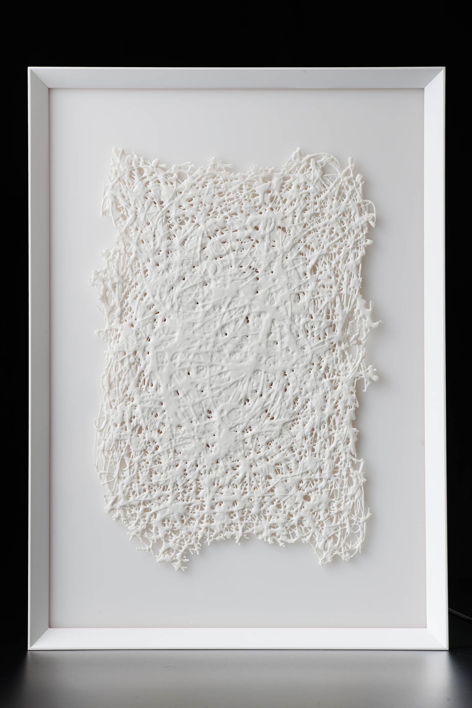 磁土の高い透光性を生かした作品をずっと作りたいと思っていた。ある博物館を訪れた際に、最先端の顕微鏡で神経細胞を観察する機会を得た。バックライトで照らされた線状繊維のレイヤーが重なり合い、複雑に連関し合う様子は、人間が生きる姿そのものであり、とても神秘的だった。その絶え間なく動き続ける事象の瞬間を土によって創出する。それは、無機と有機の架け橋となる未知の存在のようで愛おしく思う。
