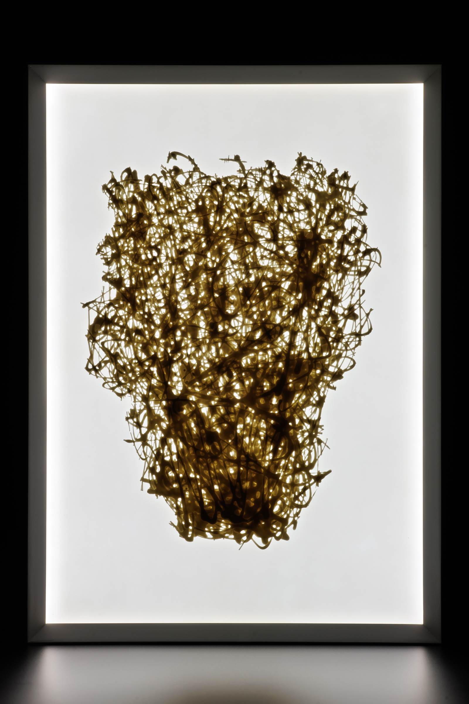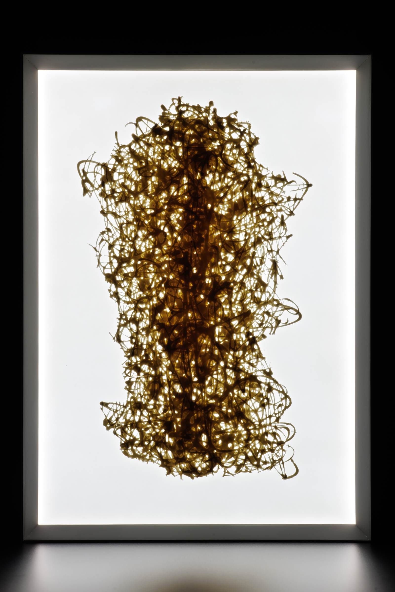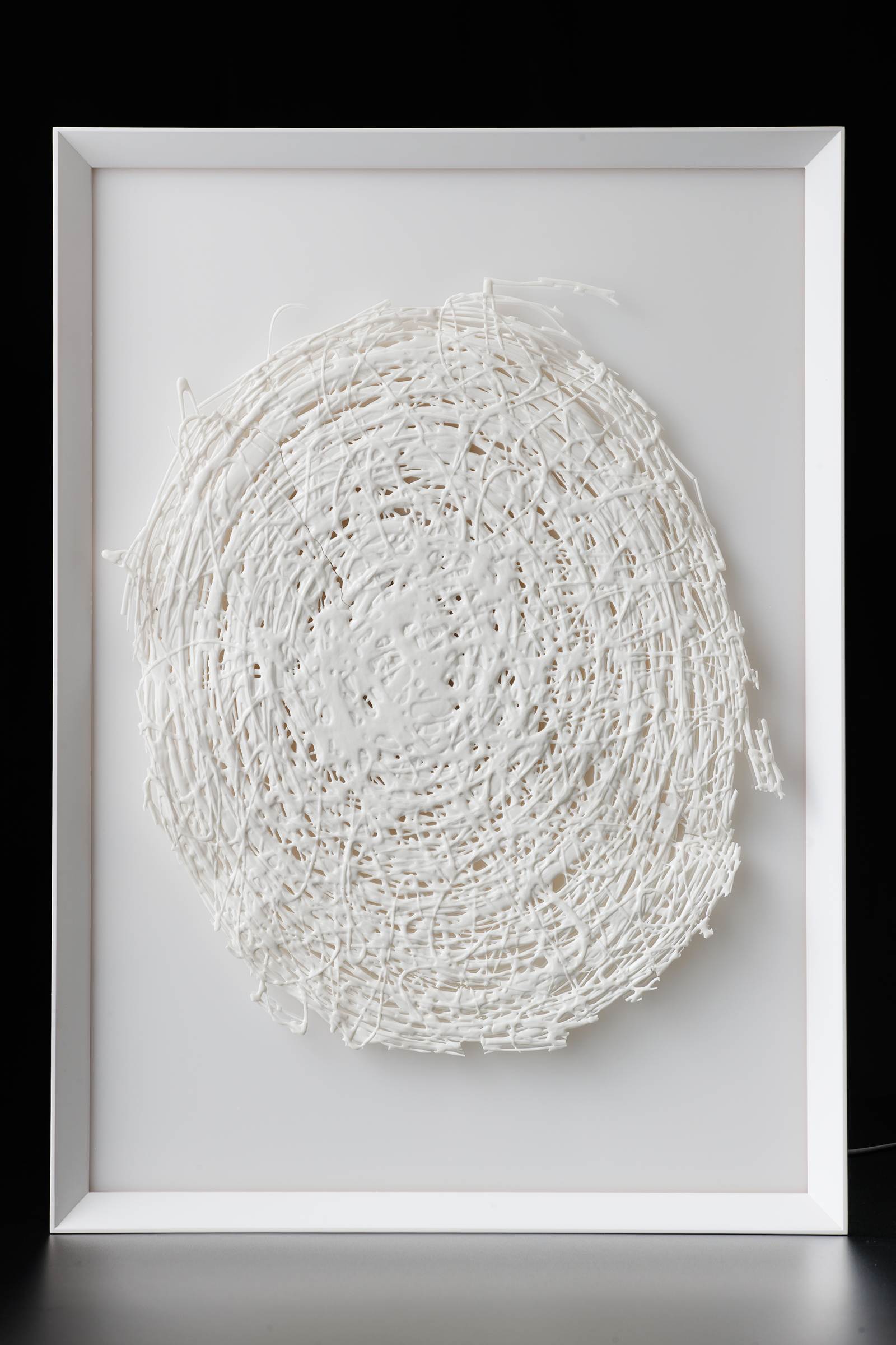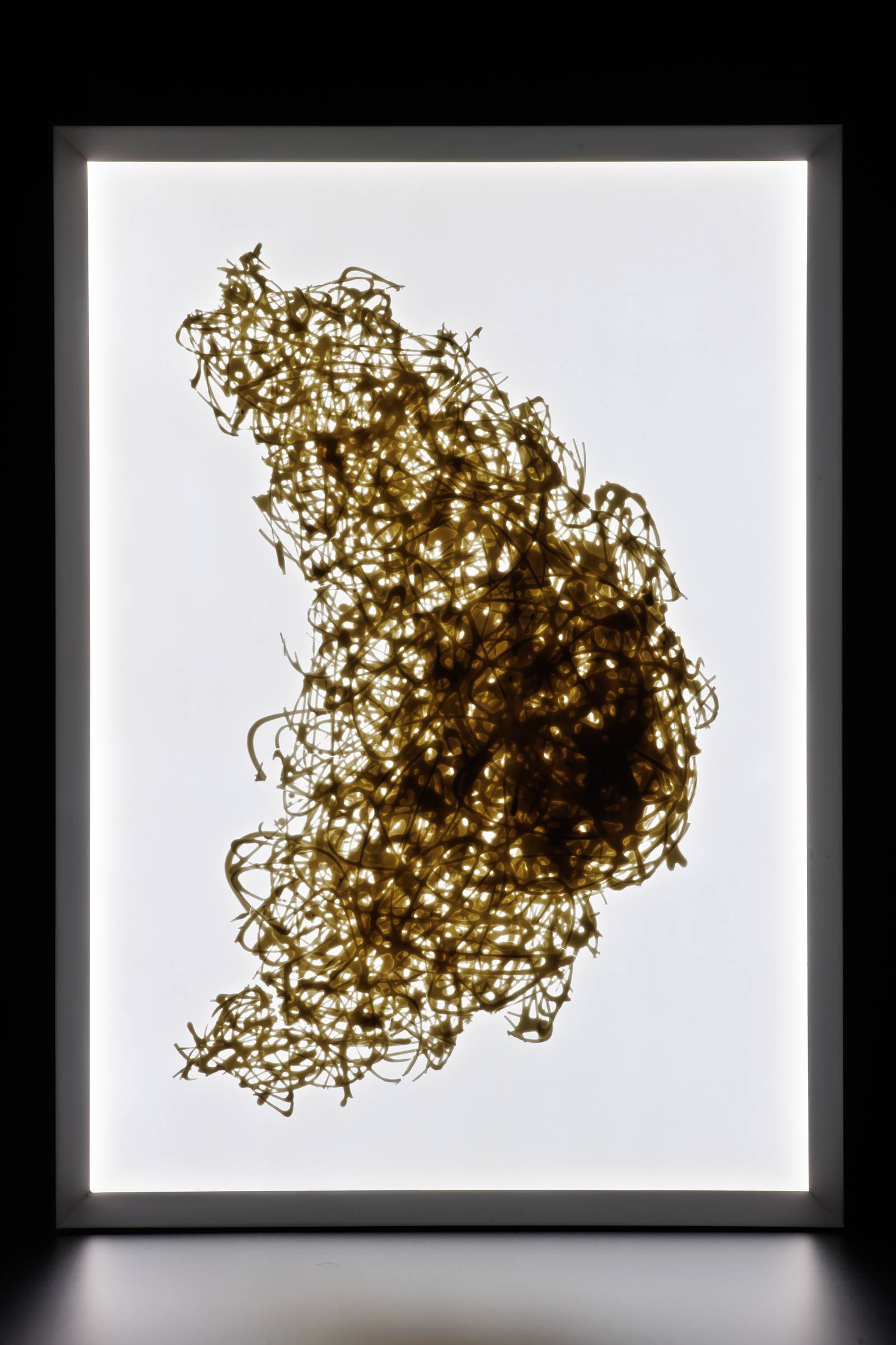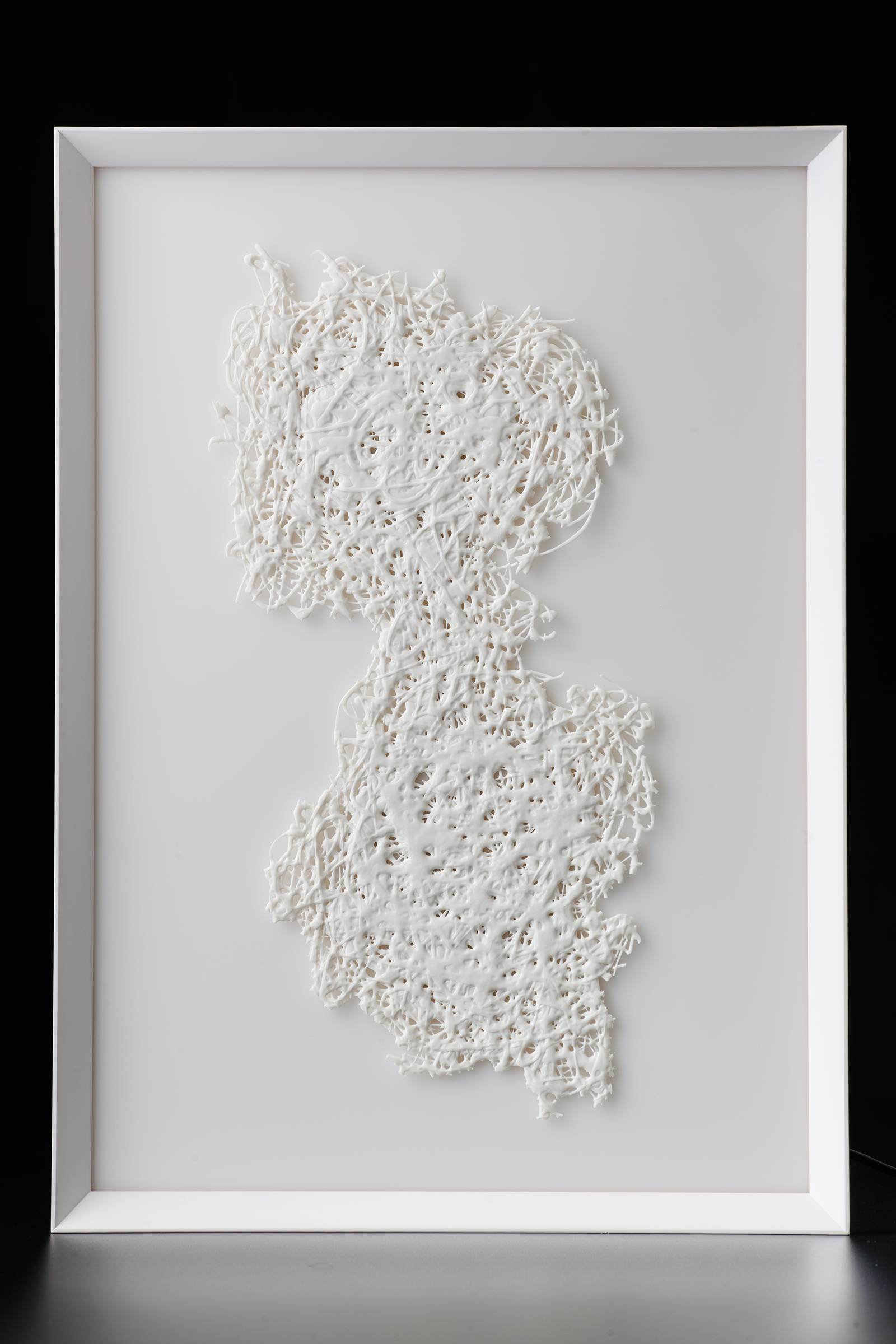 磁土の高い透光性を生かした作品をずっと作りたいと思っていた。ある博物館を訪れた際に、最先端の顕微鏡で神経細胞を観察する機会を得た。バックライトで照らされた線状繊維のレイヤーが重なり合い、複雑に連関し合う様子は、人間が生きる姿そのものであり、とても神秘的だった。その絶え間なく動き続ける事象の瞬間を土によって創出する。それは、無機と有機の架け橋となる未知の存在のようで愛おしく思う。