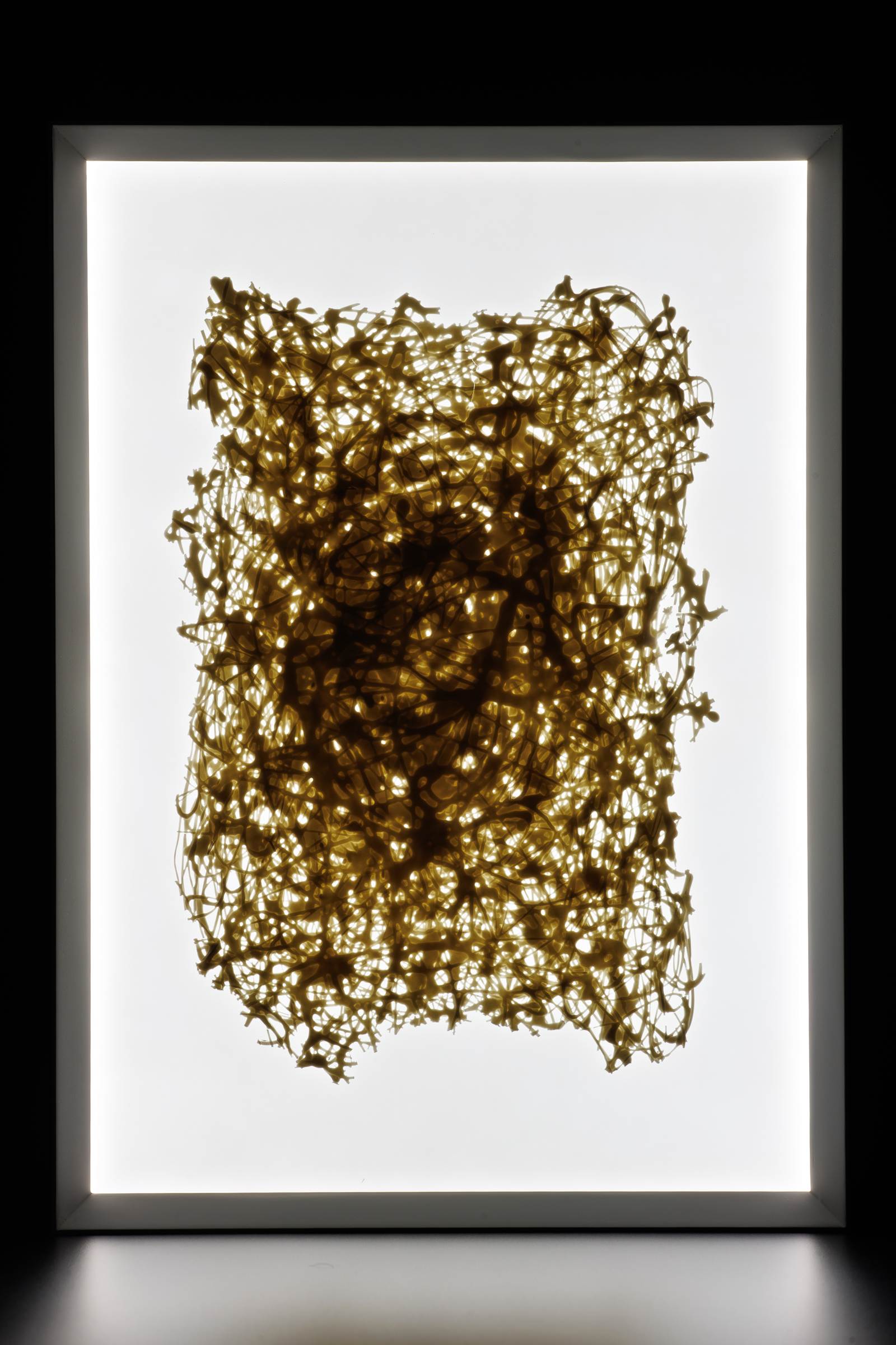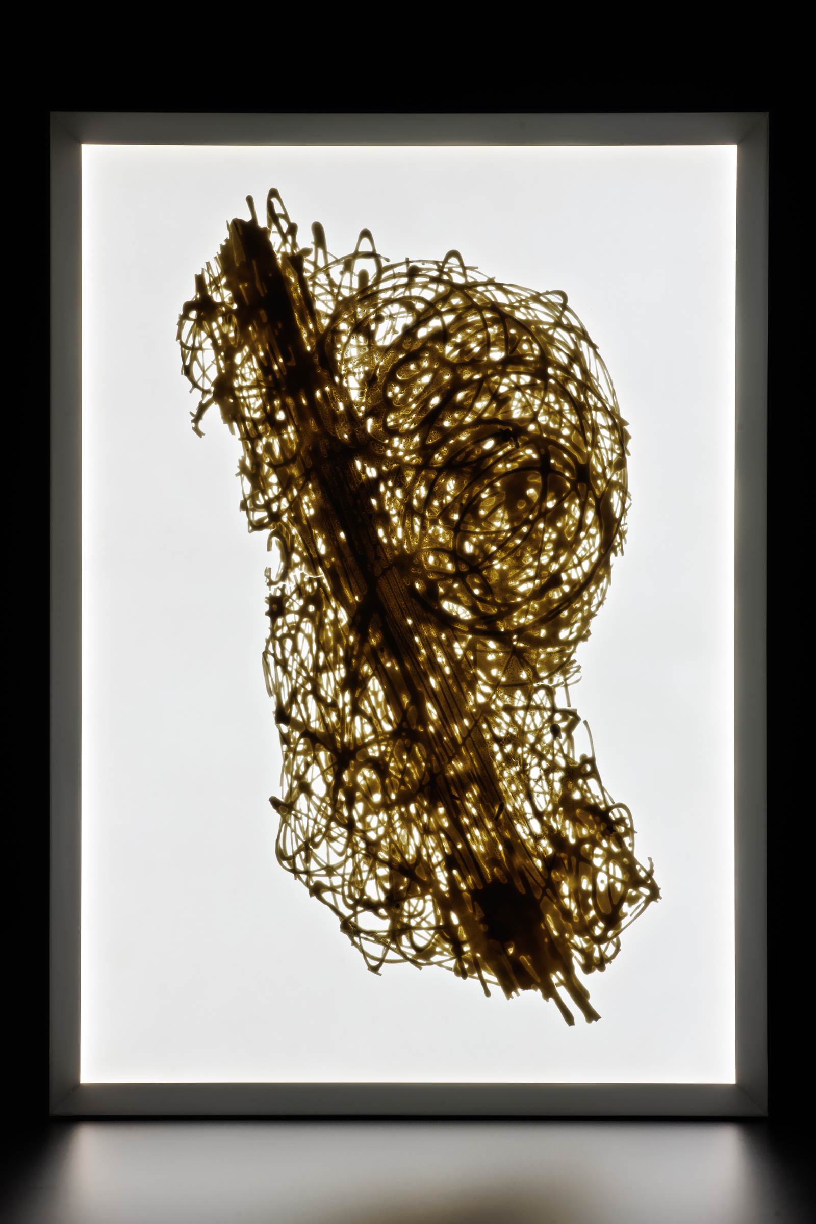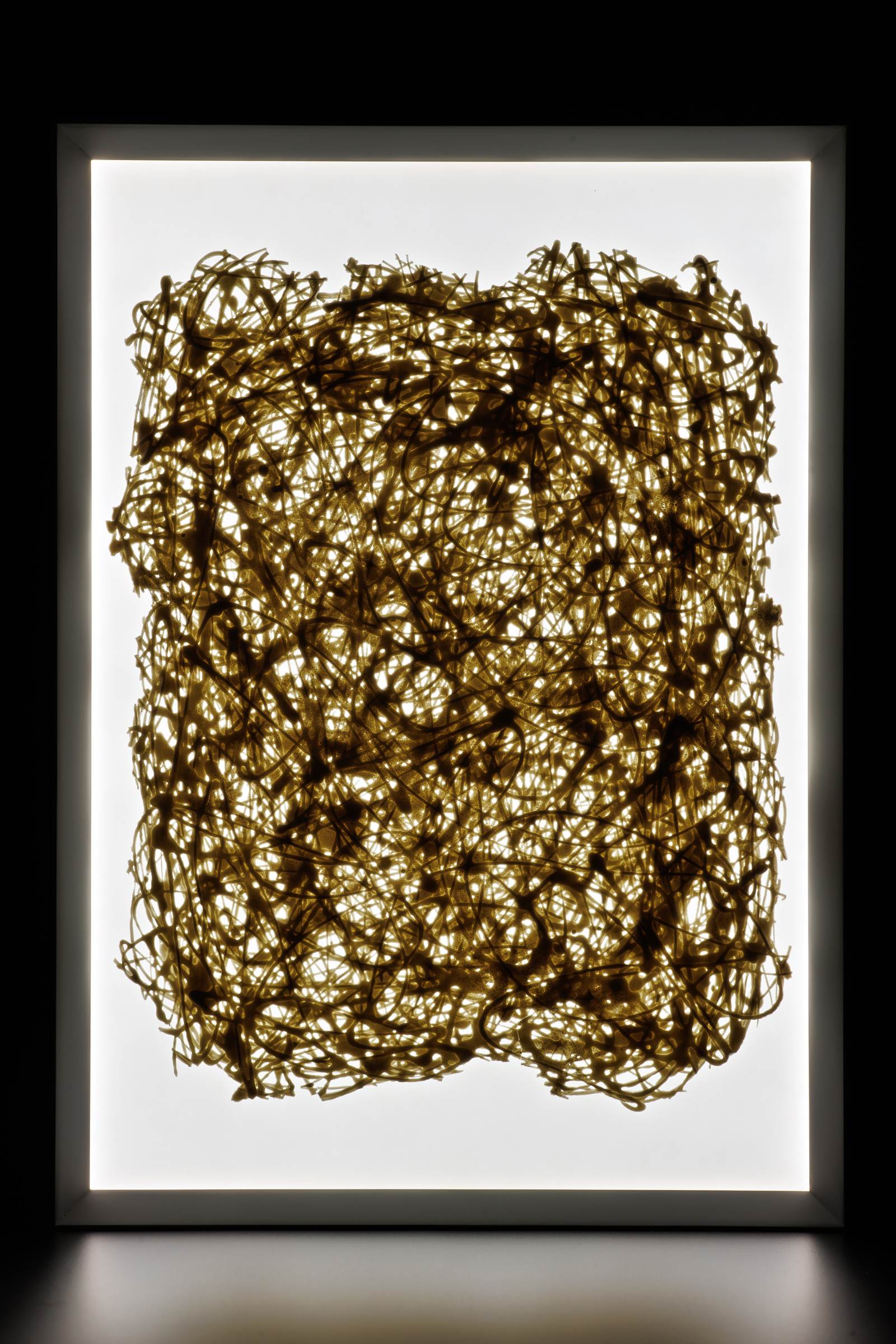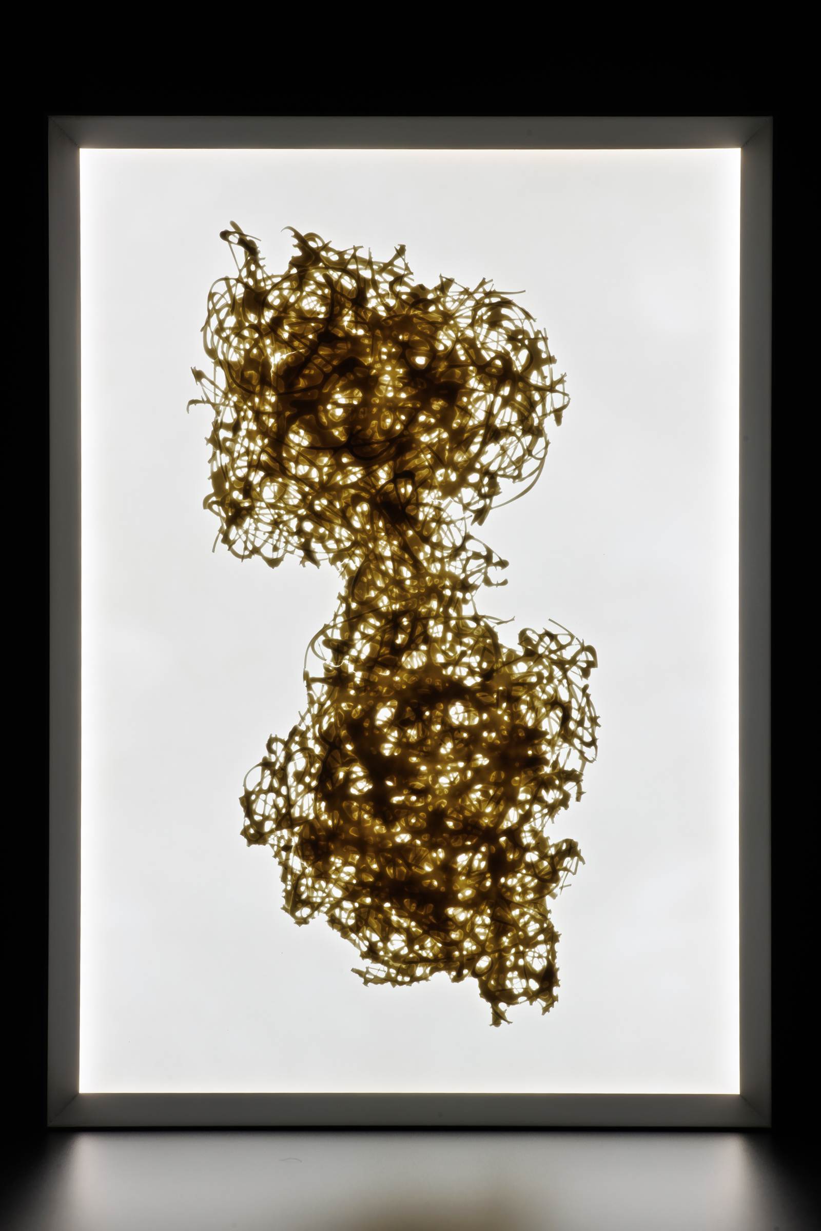 磁土の高い透光性を生かした作品をずっと作りたいと思っていた。ある博物館を訪れた際に、最先端の顕微鏡で神経細胞を観察する機会を得た。バックライトで照らされた線状繊維のレイヤーが重なり合い、複雑に連関し合う様子は、人間が生きる姿そのものであり、とても神秘的だった。その絶え間なく動き続ける事象の瞬間を土によって創出する。それは、無機と有機の架け橋となる未知の存在のようで愛おしく思う。