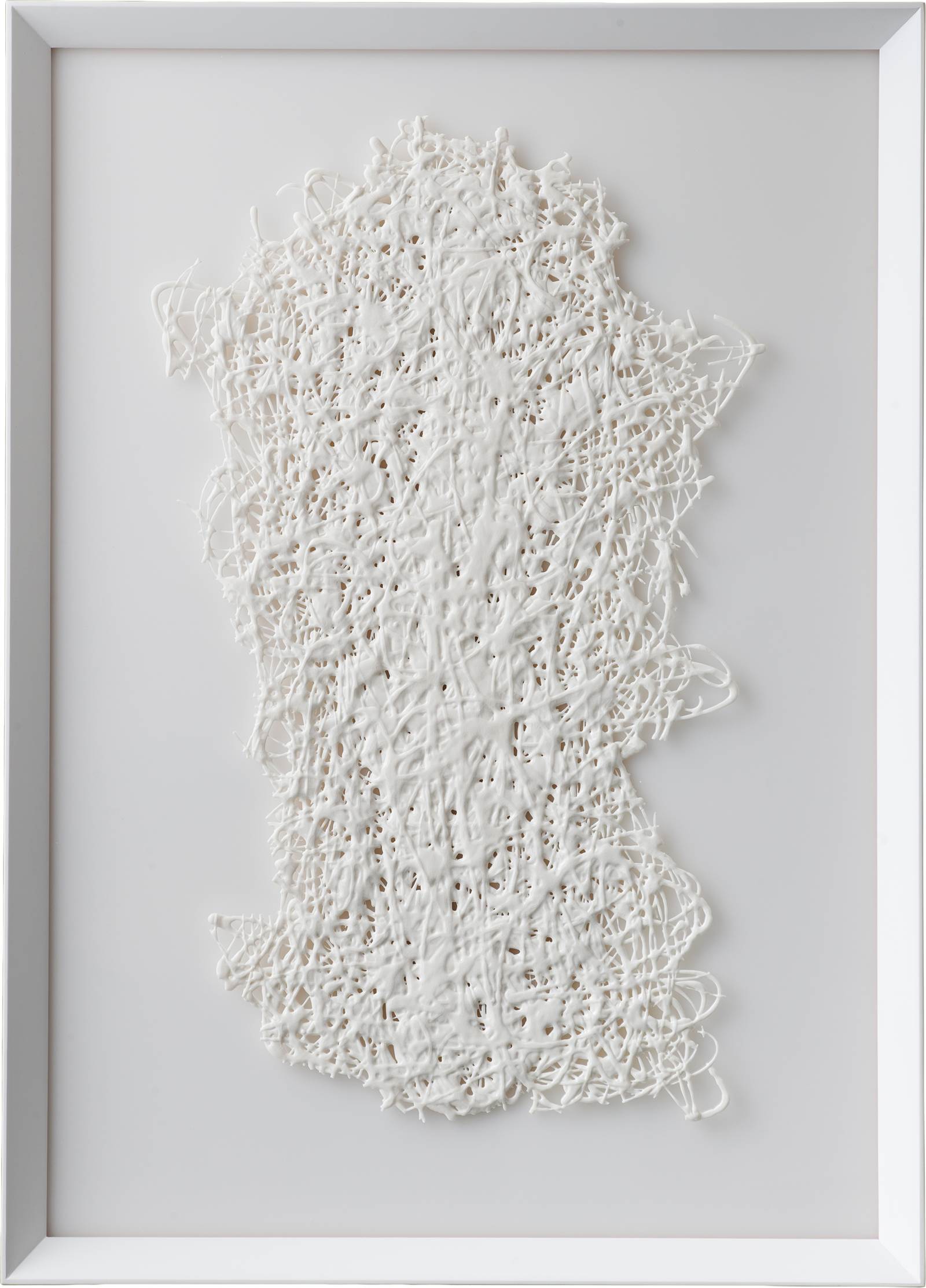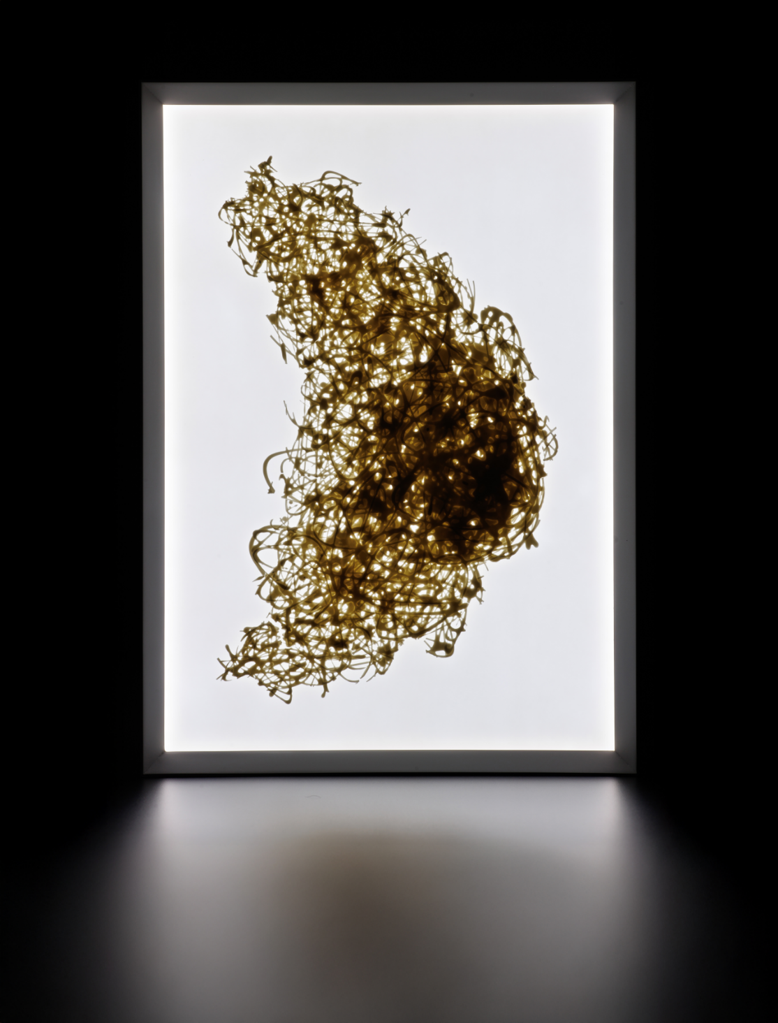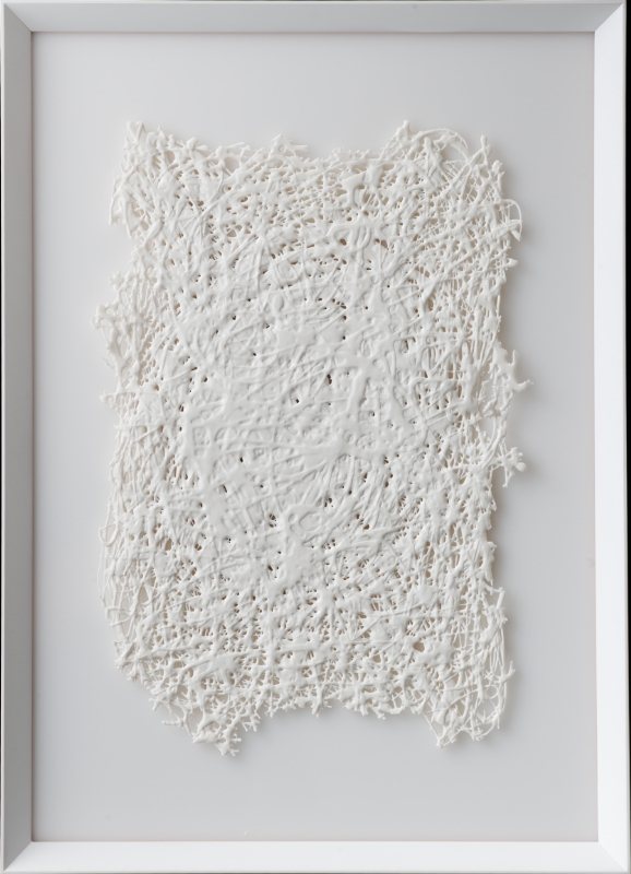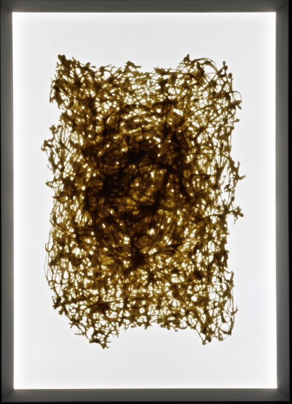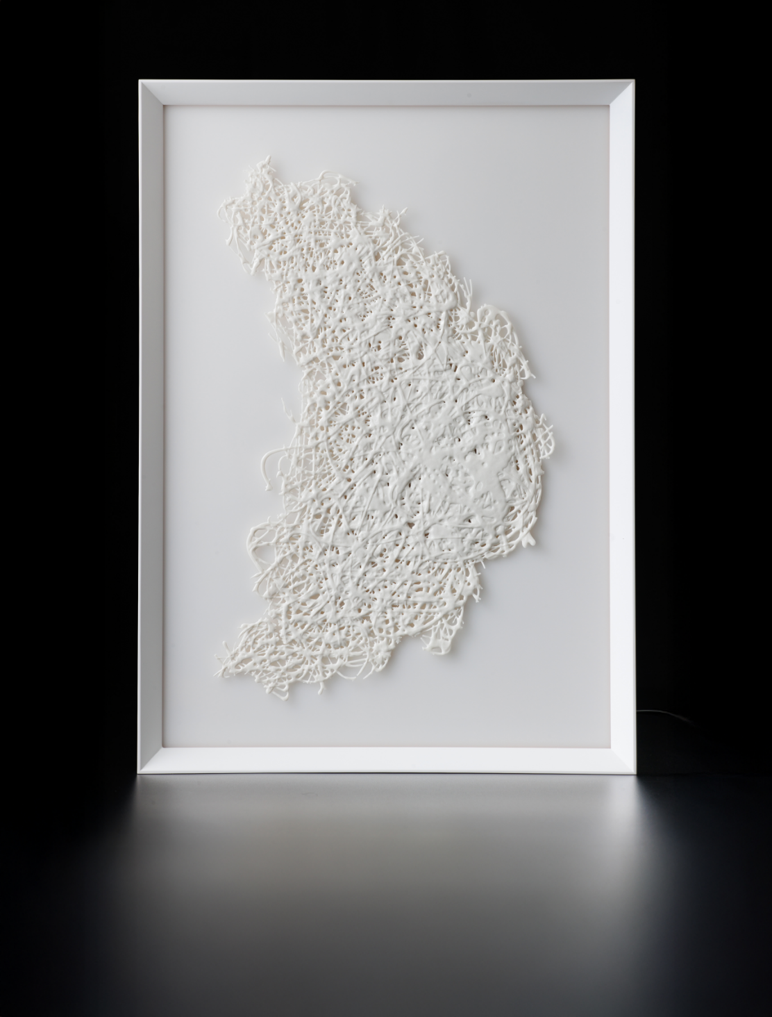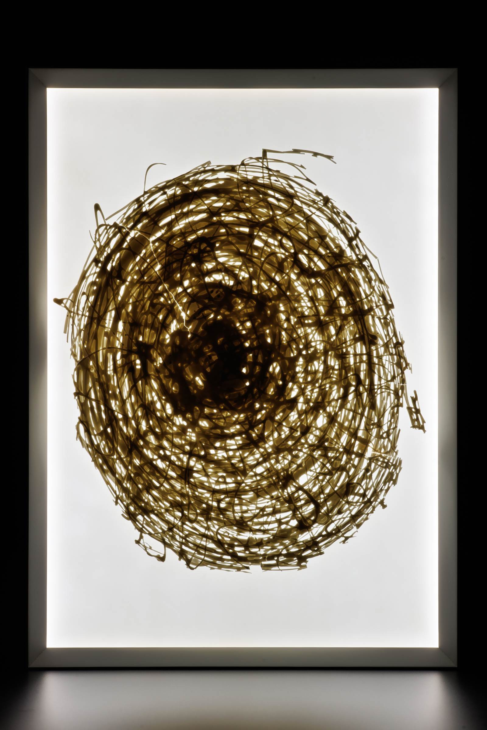 磁土の高い透光性を生かした作品をずっと作りたいと思っていた。ある博物館を訪れた際に、最先端の顕微鏡で神経細胞を観察する機会を得た。バックライトで照らされた線状繊維のレイヤーが重なり合い、複雑に連関し合う様子は、人間が生きる姿そのものであり、とても神秘的だった。その絶え間なく動き続ける事象の瞬間を土によって創出する。それは、無機と有機の架け橋となる未知の存在のようで愛おしく思う。