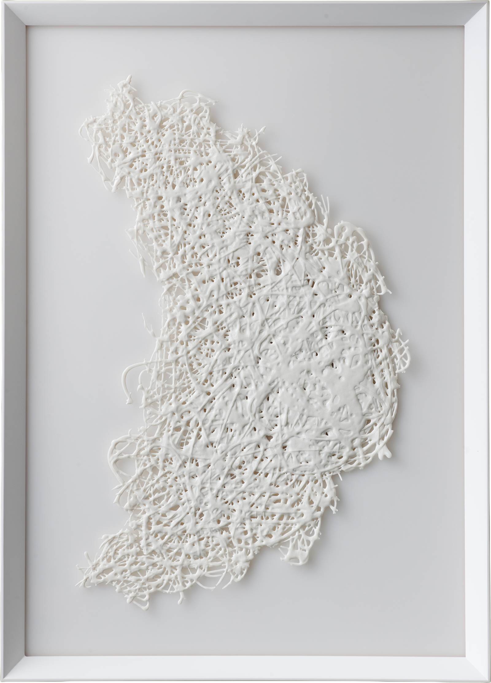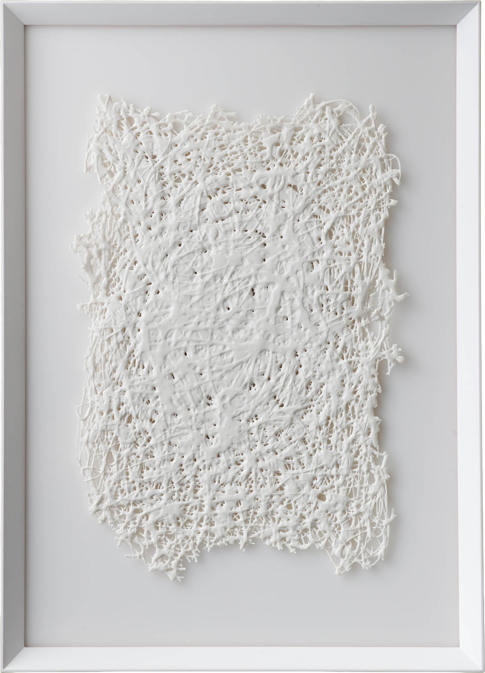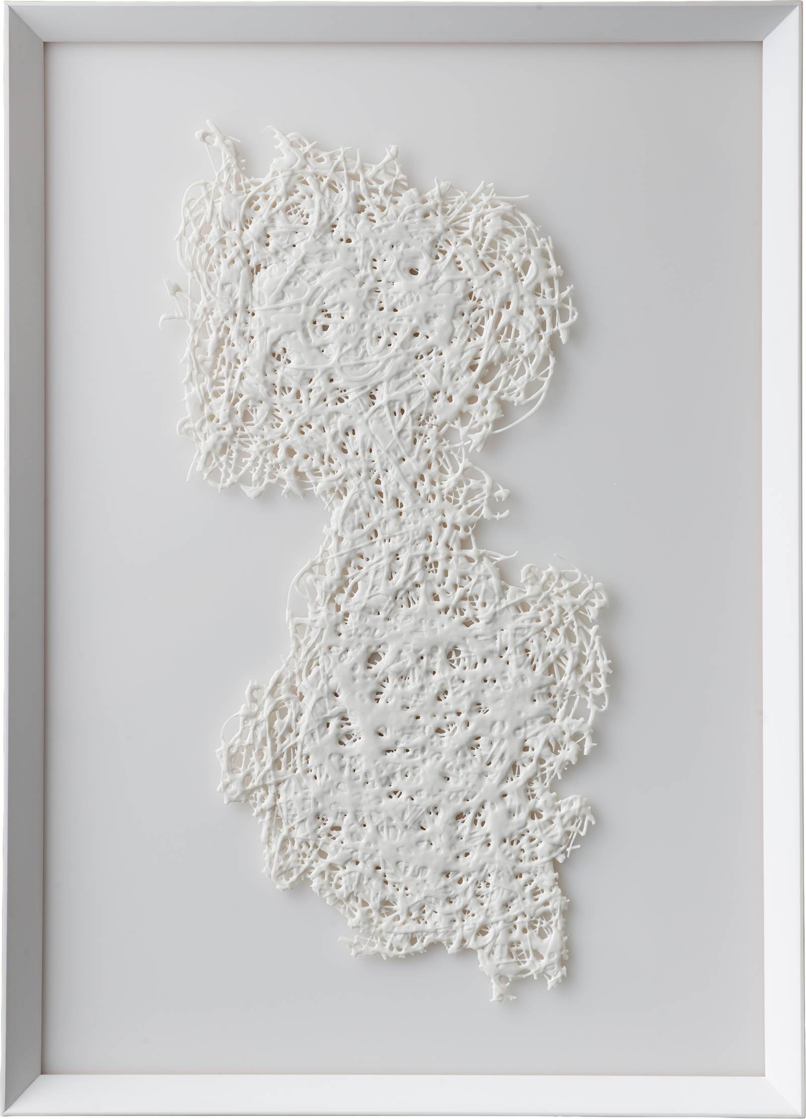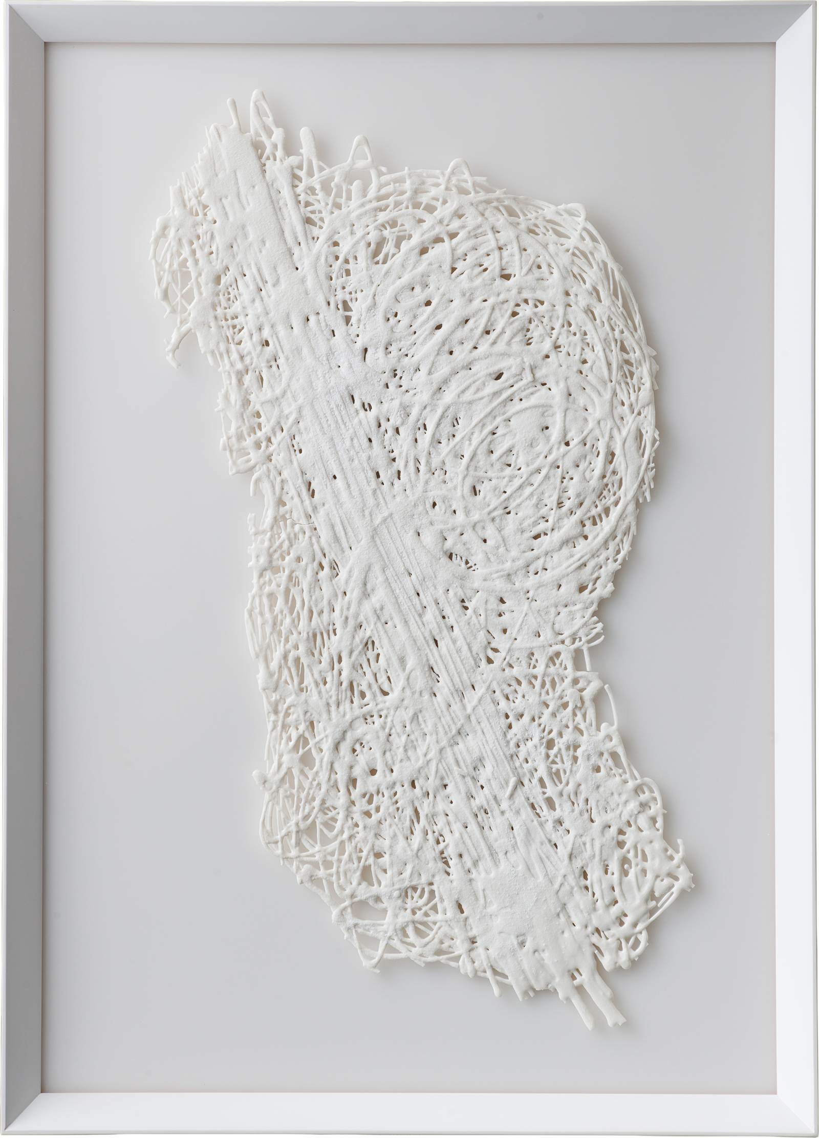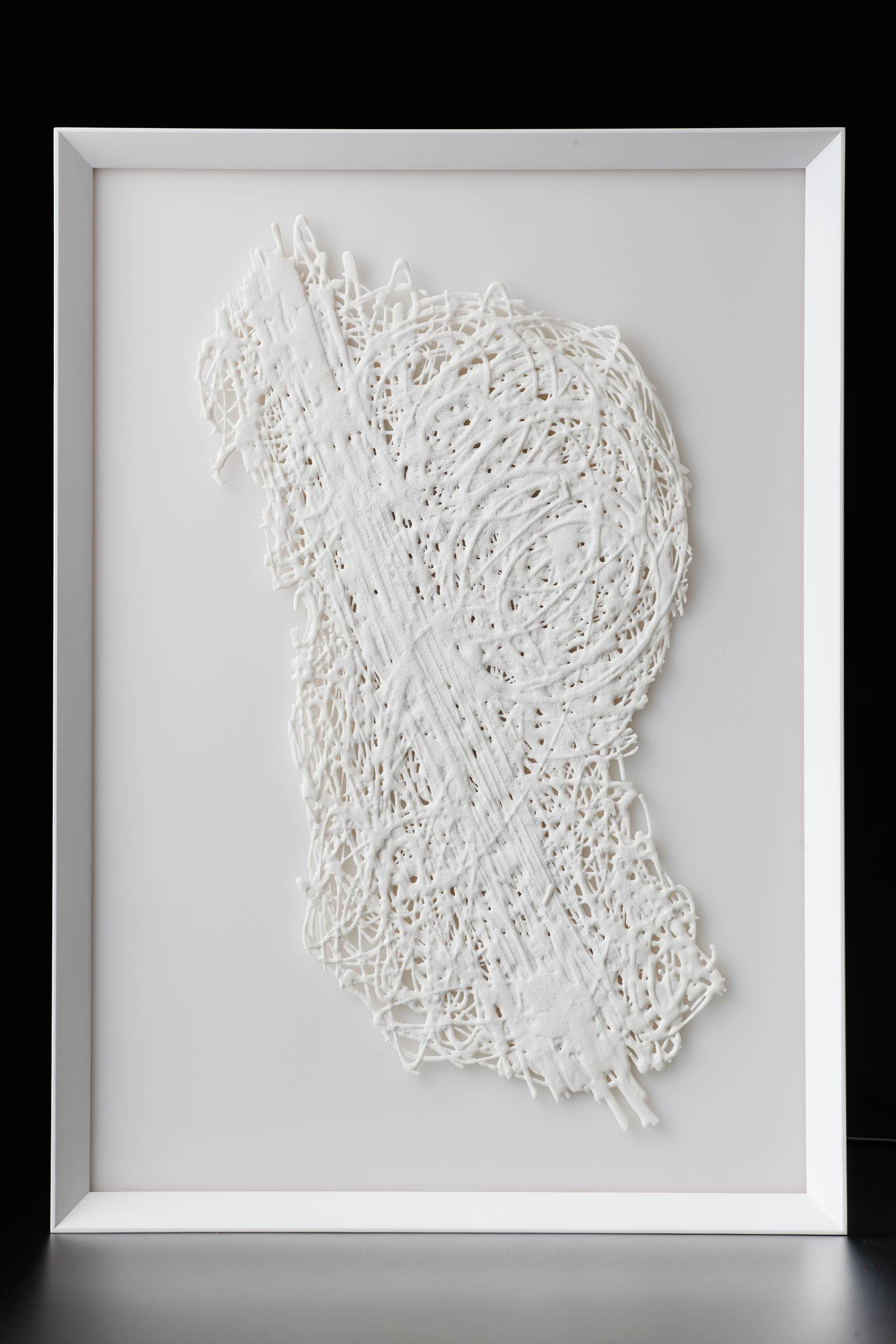 磁土の高い透光性を生かした作品をずっと作りたいと思っていた。ある博物館を訪れた際に、最先端の顕微鏡で神経細胞を観察する機会を得た。バックライトで照らされた線状繊維のレイヤーが重なり合い、複雑に連関し合う様子は、人間が生きる姿そのものであり、とても神秘的だった。その絶え間なく動き続ける事象の瞬間を土によって創出する。それは、無機と有機の架け橋となる未知の存在のようで愛おしく思う。