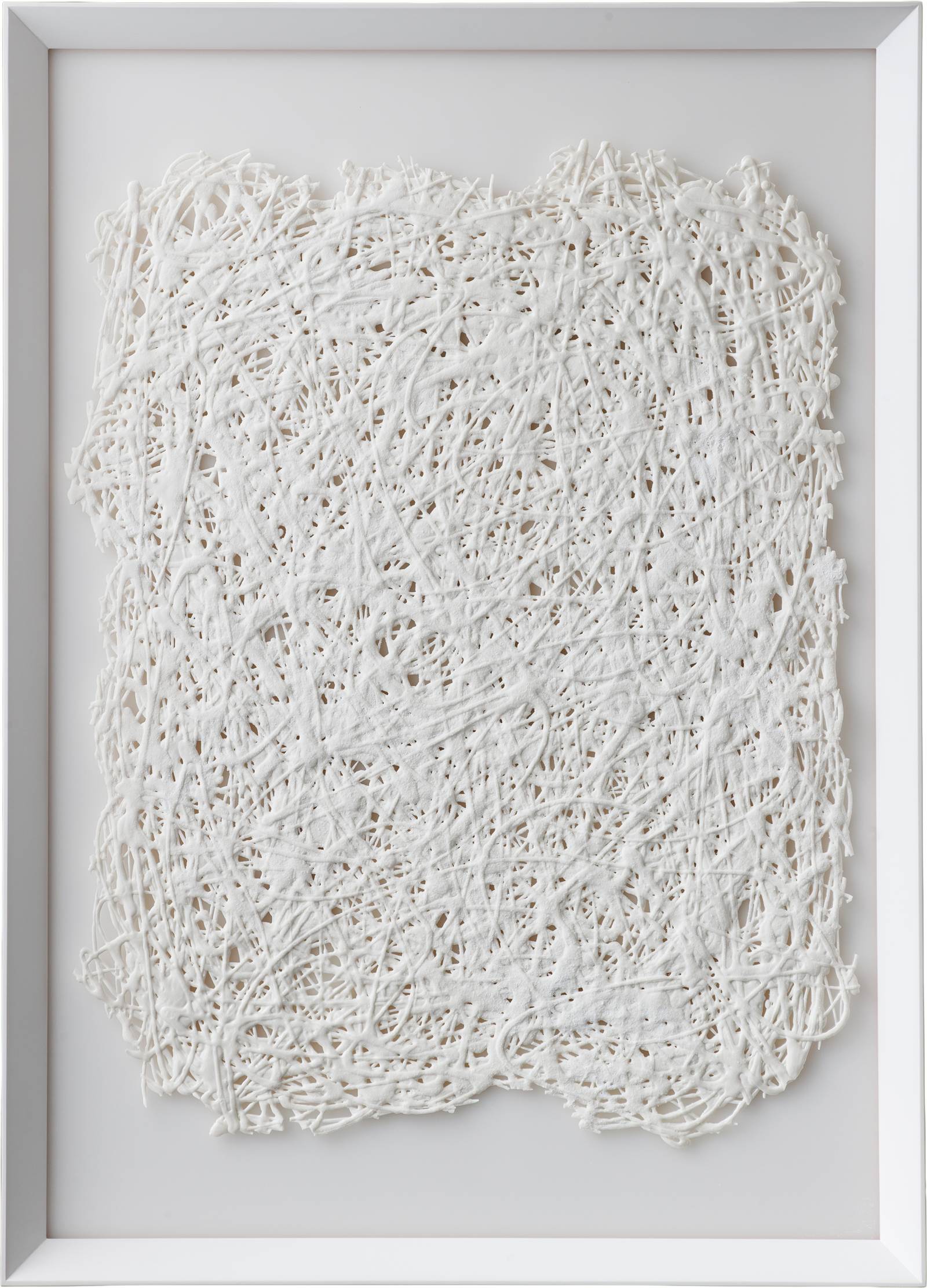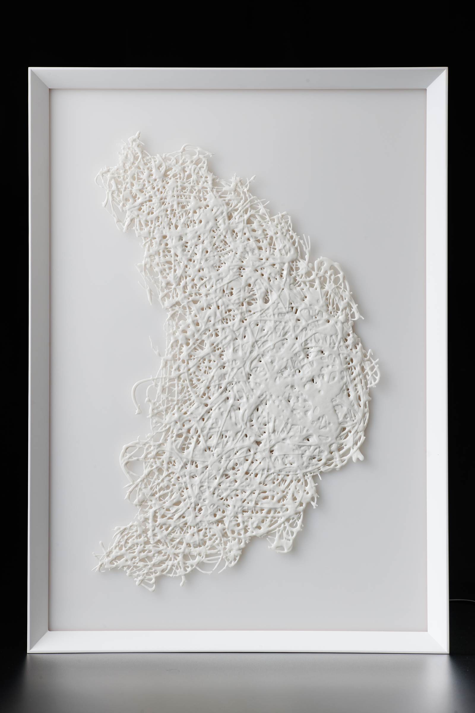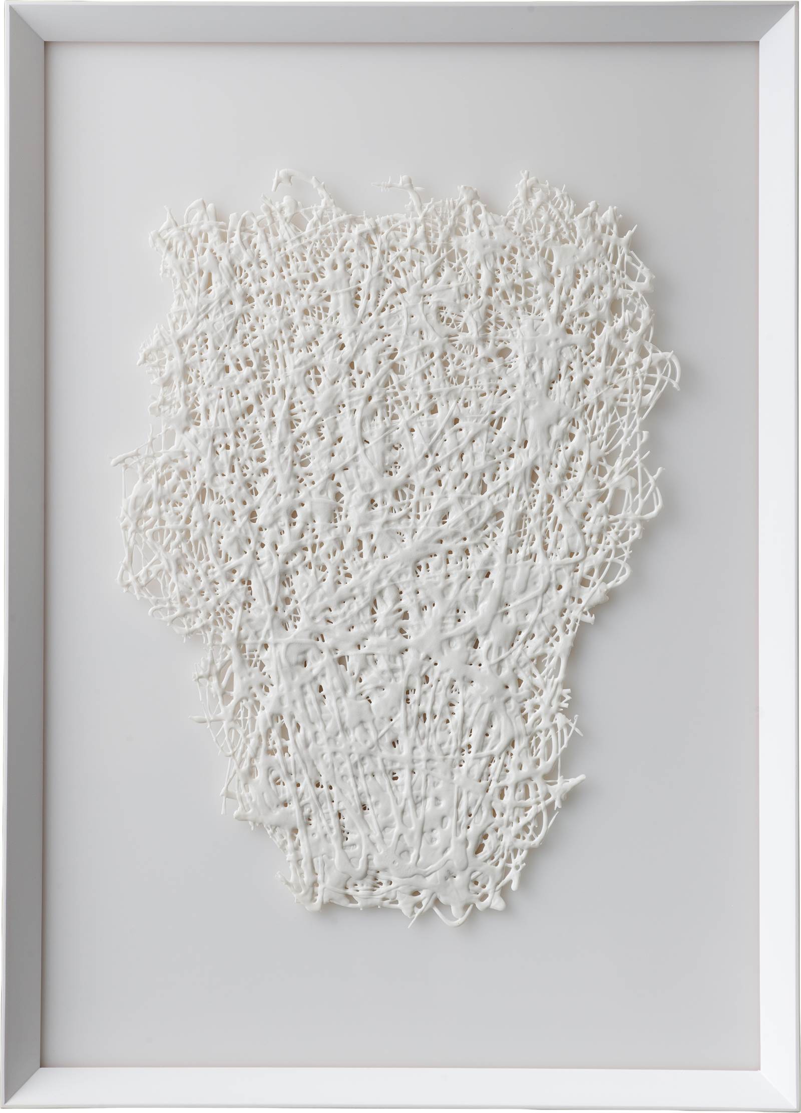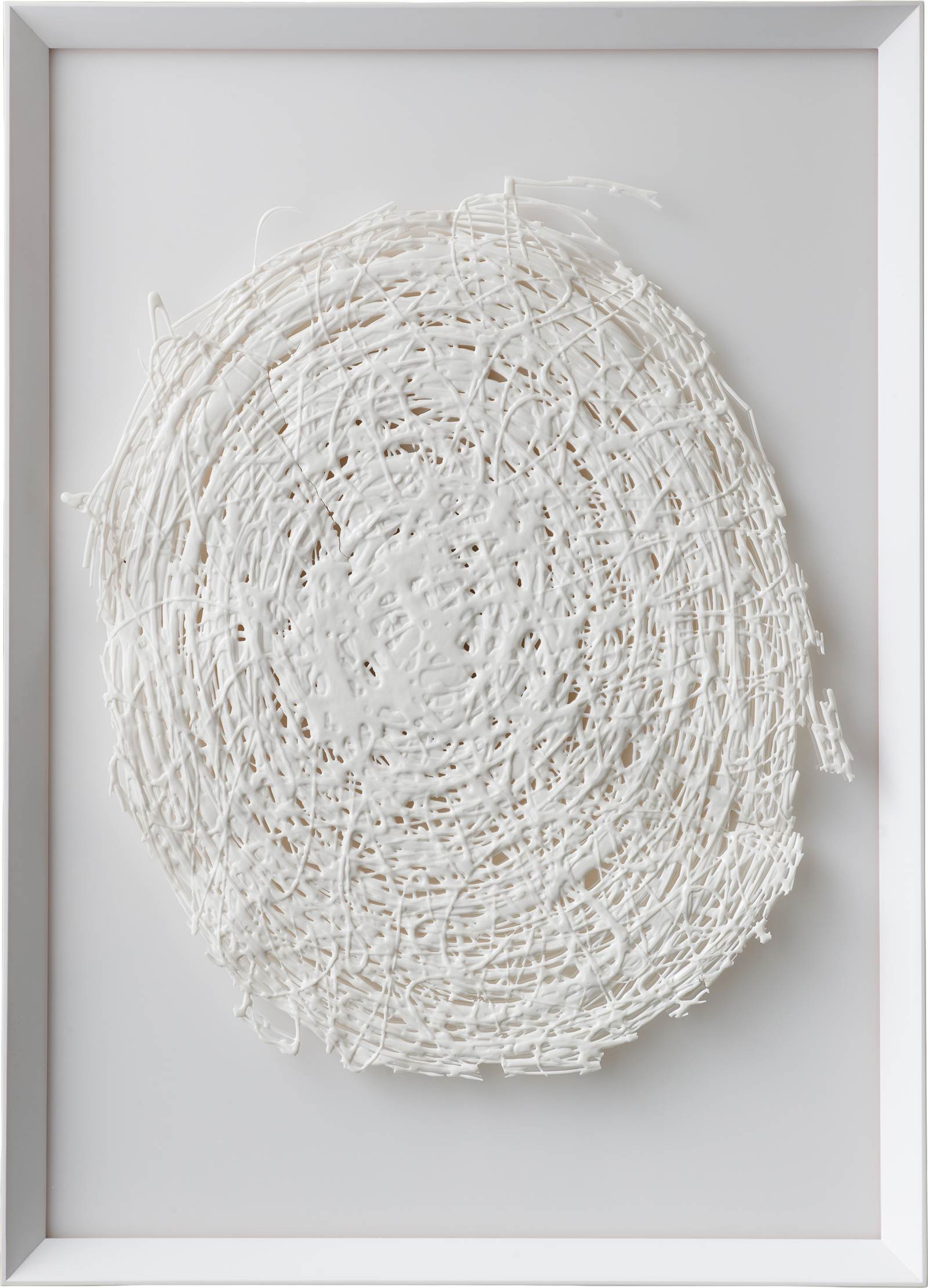 磁土の高い透光性を生かした作品をずっと作りたいと思っていた。ある博物館を訪れた際に、最先端の顕微鏡で神経細胞を観察する機会を得た。バックライトで照らされた線状繊維のレイヤーが重なり合い、複雑に連関し合う様子は、人間が生きる姿そのものであり、とても神秘的だった。その絶え間なく動き続ける事象の瞬間を土によって創出する。それは、無機と有機の架け橋となる未知の存在のようで愛おしく思う。